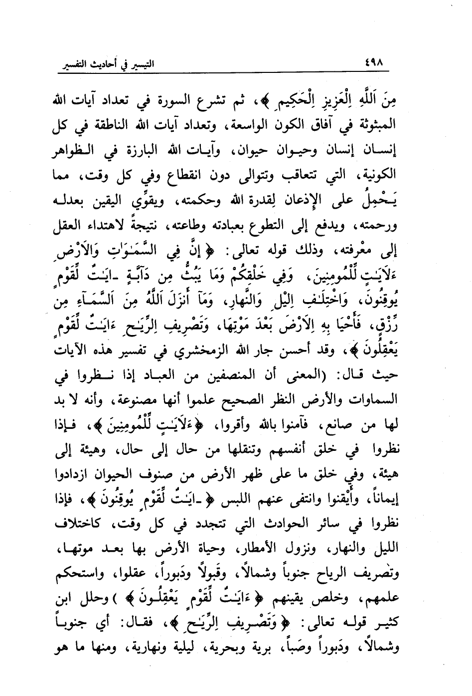 مِنَ اللَّهِ الْعَزِيزِ الْحَكِيمِ}، ثم تشرع السورة في تعداد آيات الله المبثوثة في آفاق الكون الواسعة، وتعداد آيات الله الناطقة في كل إنسان إنسان وحيوان حيوان، وآيات الله البارزة في الظواهر الكونية، التي تتعاقب وتتوالى دون انقطاع وفي كل وقت، مما يحمل على الإذعان لقدرة الله وحكمته، ويقوي اليقين بعدله ورحمته، ويدفع إلى التطوع بعبادته وطاعته، نتيجة لاهتداء العقل إلى معرفته، وذلك قوله تعالى: {إِنَّ فِي السَّمَاوَاتِ وَالْأَرْضِ لَآيَاتٍ لِلْمُؤْمِنِينَ * وَفِي خَلْقِكُمْ وَمَا يَبُثُّ مِنْ دَابَّةٍ آيَاتٌ لِقَوْمٍ يُوقِنُونَ * وَاخْتِلَافِ اللَّيْلِ وَالنَّهَارِ وَمَا أَنْزَلَ اللَّهُ مِنَ السَّمَاءِ مِنْ رِزْقٍ فَأَحْيَا بِهِ الْأَرْضَ بَعْدَ مَوْتِهَا وَتَصْرِيفِ الرِّيَاحِ آيَاتٌ لِقَوْمٍ يَعْقِلُونَ}، وقد أحسن جار الله الزمخشري في تفسير هذه الآيات حيث قال: (المعنى أن المنصفين من العباد إذا نظروا في السماوات والأرض النظر الصحيح علموا أنها مصنوعة، وأنه لا بد لها من صانع، فآمنوا بالله وأقروا، {لَآيَاتٍ لِلْمُؤْمِنِينَ}، فإذا نظروا في خلق أنفسهم وتنقلها من حال إلى حال، وهيئة إلى هيئة، وفي خلق ما على ظهر الأرض من صنوف الحيوان ازدادوا إيمانا، وأيقنوا وانتفى عنهم اللبس {آيَاتٌ لِقَوْمٍ يُوقِنُونَ}، فإذا نظروا في سائر الحوادث التي تتجدد في كل وقت، كاختلاف الليل والنهار، ونزول الأمطار، وحياة الأرض بها بعد موتها، وتصريف الرياح جنوبا وشمالا، وقبولا ودبورا، عقلوا، واستحكم علمهم، وخلص يقينهم {آيَاتٌ لِقَوْمٍ يَعْقِلُونَ} وحلل ابن كثير قوله تعالى: {وَتَصْرِيفِ الرِّيَاحِ}، فقال: أي جنوبا وشمالا، ودبورا وصبا، برية وبحرية، ليلية ونهارية، ومنها ما هو