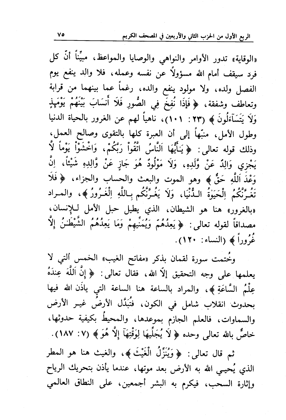 (الوقاية) تدور الأوامر والنواهي والوصايا والمواعظ، مبينا أن كل فرد سيقف أمام الله مسؤولا عن نفسه وعمله، فلا والد ينفع يوم الفصل ولده، ولا مولود ينفع والده، رغما عما بينهما من قرابة وتعاطف وشفقة، {فَإِذَا نُفِخَ فِي الصُّورِ فَلَا أَنْسَابَ بَيْنَهُمْ يَوْمَئِذٍ وَلَا يَتَسَاءَلُونَ} (101: 23)، ناهيا لهم عن الغرور بالحياة الدنيا وطول الأمل، منبها إلى أن العبرة كلها بالتقوى وصالح العمل، وذلك قوله تعالى: {يَا أَيُّهَا النَّاسُ اتَّقُوا رَبَّكُمْ وَاخْشَوْا يَوْمًا لَا يَجْزِي وَالِدٌ عَنْ وَلَدِهِ وَلَا مَوْلُودٌ هُوَ جَازٍ عَنْ وَالِدِهِ شَيْئًا إِنَّ وَعْدَ اللَّهِ حَقٌّ} وهو الموت والبعث والحساب والجزاء، {فَلَا تَغُرَّنَّكُمُ الْحَيَاةُ الدُّنْيَا وَلَا يَغُرَّنَّكُمْ بِاللَّهِ الْغَرُورُ}، والمراد (بالغرور) هنا هو الشيطان، الذي يطيل حبل الأمل للإنسان، مصداقا لقوله تعالى: {يَعِدُهُمْ وَيُمَنِّيهِمْ وَمَا يَعِدُهُمُ الشَّيْطَانُ إِلَّا غُرُورًا} (النساء: 120).