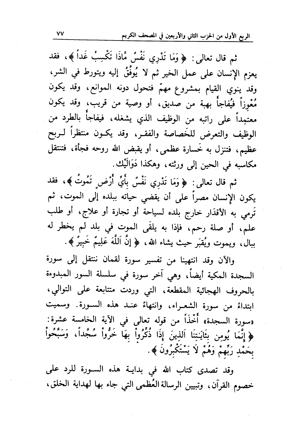 والآن وقد انتهينا من تفسير سورة لقمان ننتقل إلى سورة السجدة المكية أيضا، وهي آخر سورة في سلسلة السور المبدوءة بالحروف الهجائية المقطعة، التي وردت متتابعة على التوالي، ابتداء من سورة الشعراء، وانتهاء عند هذه السورة. وسميت (سورة السجدة) أخذا من قوله تعالى في الآية الخامسة عشر: {إِنَّمَا يُؤْمِنُ بِآيَاتِنَا الَّذِينَ إِذَا ذُكِّرُوا بِهَا خَرُّوا سُجَّدًا وَسَبَّحُوا بِحَمْدِ رَبِّهِمْ وَهُمْ لَا يَسْتَكْبِرُونَ}.