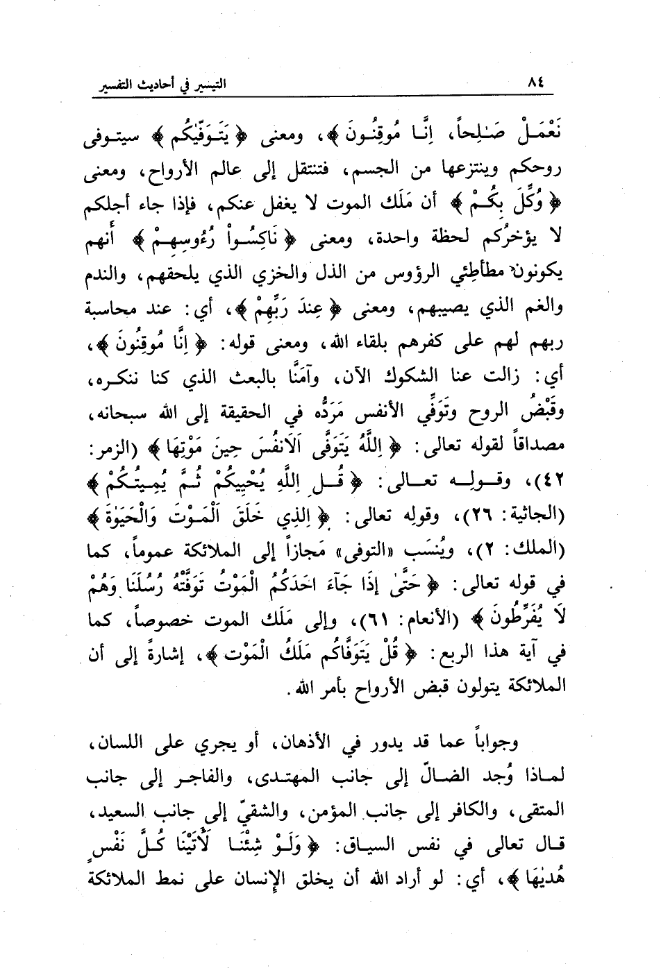نَعْمَلْ صَالِحًا إِنَّا مُوقِنُونَ}، ومعنى {يَتَوَفَّاكُمْ} سيتوفى روحكم وينتزعها من الجسم، فتنتقل إلى عالم الأرواح، ومعنى {وُكِّلَ بِكُمْ} أن ملك الموت لا يغفل عنكم، فإذا جاء أجلكم لا يؤخركم لحظة واحدة، ومعنى {نَاكِسُو رُءُوسِهِمْ} أنهم يكونون مطأطئي الرؤوس من الذل والخزي الذي يلحقهم، والندم والغم الذي يصيبهم، ومعنى {عِنْدَ رَبِّهِمْ}، أي: عند محاسبة ربهم لهم على كفرهم بلقاء الله، ومعنى قوله: {إِنَّا مُوقِنُونَ}، أي: زالت عنا الشكوك الآن، وآمنا بالبعث الذي كنا ننكره، وقبض الروح وتوفي الأنفس مرده في الحقيقة إلى الله سبحانه، مصداقا لقوله تعالى: {اللَّهُ يَتَوَفَّى الْأَنْفُسَ حِينَ مَوْتِهَا} (الزمر: 42)، وقوله تعالى: {قُلِ اللَّهُ يُحْيِيكُمْ ثُمَّ يُمِيتُكُمْ} (الجاثية26)، وقوله تعالى: {الَّذِي خَلَقَ الْمَوْتَ وَالْحَيَاةَ} (الملك: 2)، وينسب (التوفى) مجازا إلى الملائكة عموما، كما في قوله تعالى: {حَتَّى إِذَا جَاءَ أَحَدَكُمُ الْمَوْتُ تَوَفَّتْهُ رُسُلُنَا وَهُمْ لَا يُفَرِّطُونَ} (الأنعام: 61)، وإلى ملك الموت خصوصا، كما في آية هذا الربع: {قُلْ يَتَوَفَّاكُمْ مَلَكُ الْمَوْتِ}، إشارة إلى أن الملائكة يتولون قبض الأرواح بأمر الله.