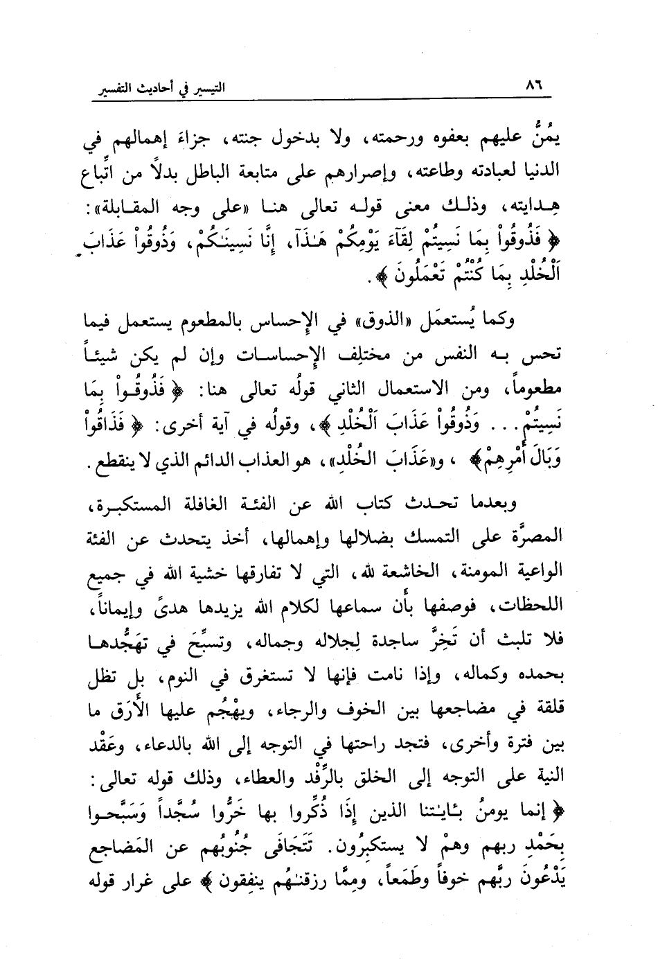 وبعدما تحدث كتاب الله عن الفئة الغافلة المستكبرة، المصرة على التمسك بضلالها وإهمالها، أخذ يتحدث عن الفئة الواعية المؤمنة، الخاشعة لله، التي لا تفارقها خشية الله في جميع اللحظات، فوصفها بأن سماعها لكلام الله يزيدها هدى وإيمانا، فلا تلبث أن تخر ساجدة لجلاله وجماله، وتسبح في تهجدها بحمده وكماله، وإذا نامت فإنها لا تستغرق في النوم، بل تظل قلقة في مضاجعها بين الخوف والرجاء، ويهجم عليها الأرق ما بين فترة وأخرى، فتجد راحتها في التوجه إلى الله بالدعاء وعقد النية على التوجه إلى الخلق بالرفد والعطاء، وذلك قوله تعالى: {إِنَّمَا يُؤْمِنُ بِآيَاتِنَا الَّذِينَ إِذَا ذُكِّرُوا بِهَا خَرُّوا سُجَّدًا وَسَبَّحُوا بِحَمْدِ رَبِّهِمْ وَهُمْ لَا يَسْتَكْبِرُونَ * تَتَجَافَى جُنُوبُهُمْ عَنِ الْمَضَاجِعِ يَدْعُونَ رَبَّهُمْ خَوْفًا وَطَمَعًا وَمِمَّا رَزَقْنَاهُمْ يُنْفِقُونَ} على غرار قوله