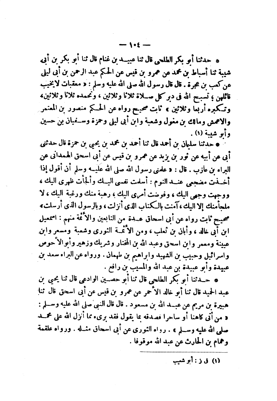 حَدَّثَنَا أَبُو بَكْرٍ الطَّلْحِيُّ، ثنا عُبَيْدُ بْنُ غَنَّامٍ، ثنا أَبُو بَكْرِ بْنُ أَبِي شَيْبَةَ، ثنا أَسْبَاطُ بْنُ مُحَمَّدٍ، عَنْ عَمْرِو بْنِ قَيْسٍ، عَنِ الْحَكَمِ عَنْ عَبْدِ الرَّحْمَنِ بْنِ أَبِي لَيْلَى، عَنْ ابْنِ عُجْرَةَ، قَالَ: قَالَ رَسُولُ اللهِ صَلَّى اللهُ عَلَيْهِ وَسَلَّمَ: " §مُعَقِّبَاتٌ لَا يَخِيبُ قَائِلُهُنَّ: تُسَبِّحُ اللهَ فِي دُبُرِ كُلِّ صَلَاةٍ ثَلَاثًا وَثَلَاثِينَ، وَتَحْمَدُهُ ثَلَاثًا وَثَلَاثِينَ، وَتُكَبِّرُهُ أَرْبَعًا وَثَلَاثِينَ " ثَابِتٌ صَحِيحٌ، رَوَاهُ عَنِ الْحَكَمِ، مَنْصُورُ بْنُ الْمُعْتَمِرِ، وَالْأَعْمَشُ، وَمَالِكُ بْنُ مِغْوَلٍ، وَشُعْبَةُ، وَابْنُ أَبِي لَيْلَى، وَحَمْزَةُ، وَسُفْيَانُ بْنُ حُسَيْنٍ، وَأَبُو شَيْبَةَ