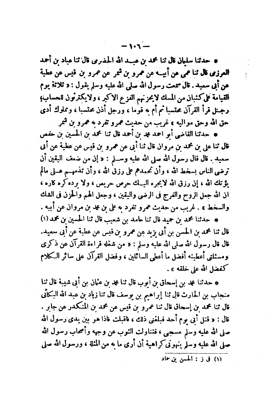 حَدَّثَنَا مُحَمَّدُ بْنُ حُمَيْدٍ، قَالَ: ثنا حَامِدُ بْنُ شُعَيْبٍ، قَالَ: ثنا الْحُسَيْنُ بْنُ مُحَمَّدٍ، قَالَ: ثنا مُحَمَّدُ بْنُ الْحَسَنِ بْنِ أَبِي يَزِيدَ، عَنْ عَمْرِو بْنِ قَيْسٍ، عَنْ عَطِيَّةَ، عَنْ أَبِي سَعِيدٍ، قَالَ: قَالَ النَّبِيُّ صَلَّى اللهُ عَلَيْهِ وَسَلَّمَ: «§مَنْ شَغَلَهُ قِرَاءَةُ الْقُرْآنِ عَنْ ذِكْرِي وَمَسْأَلَتِي أَعْطَيْتُهُ أَفْضَلَ مَا أُعْطِي السَّائِلِينَ، وَفَضْلُ الْقُرْآنِ عَلَى سَائِرِ الْكَلَامِ كَفَضْلِ اللهِ عَلَى خَلْقِهِ»