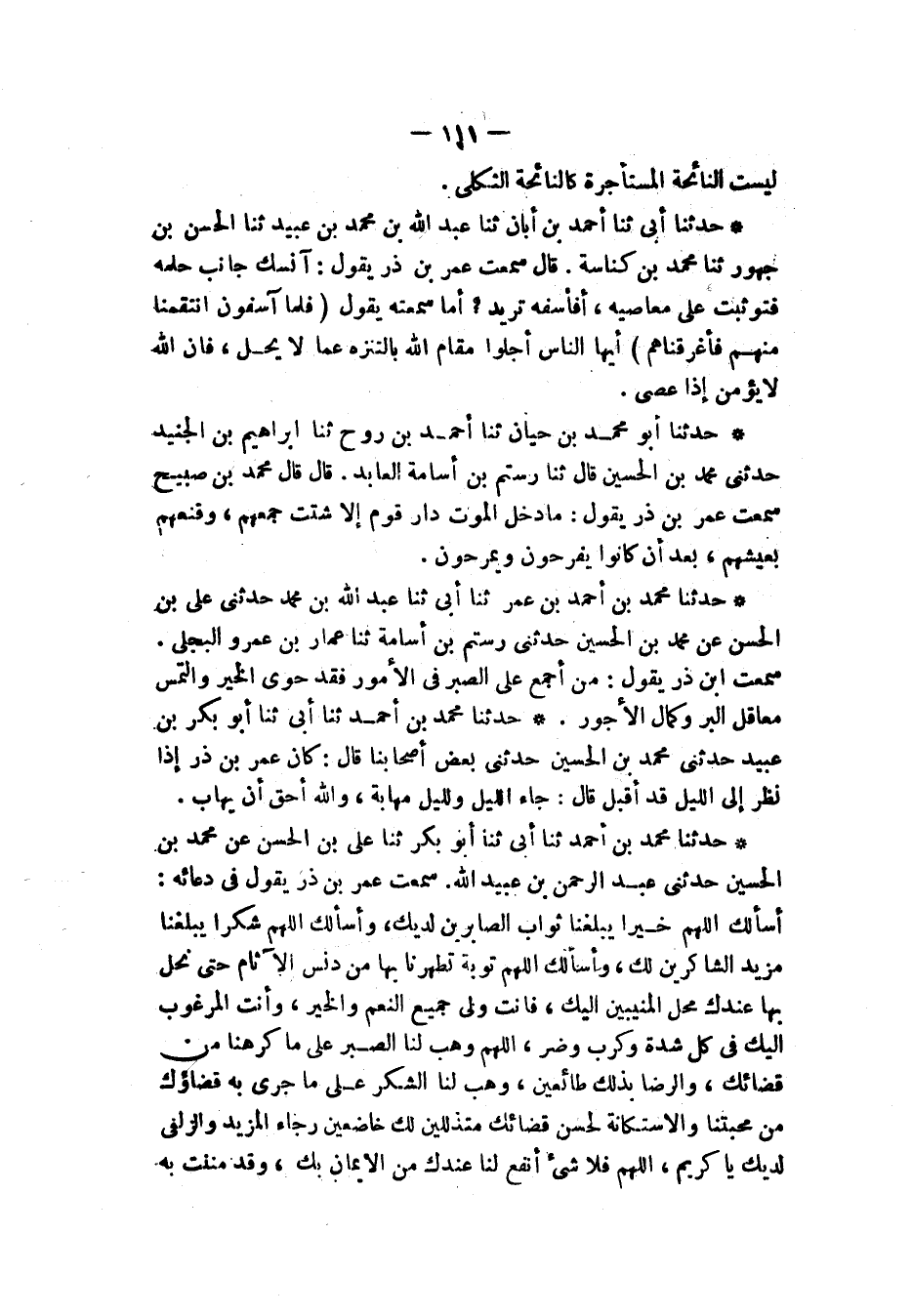 حَدَّثَنَا مُحَمَّدُ بْنُ أَحْمَدَ، ثنا أَبِي، ثنا أَبُو بَكْرٍ، ثنا عَلِيُّ بْنُ الْحَسَنِ، عَنْ مُحَمَّدِ بْنِ الْحُسَيْنِ، حَدَّثَنِي عَبْدُ الرَّحْمَنِ بْنُ عُبَيْدِ اللهِ، سَمِعْتُ عُمَرَ بْنَ ذَرٍّ، يَقُولُ فِي دُعَائِهِ: §أَسْأَلُكَ اللهُمَّ خَيْرًا يُبَلِّغُنَا ثَوَابَ الصَّابِرِينَ لَدَيْكَ، وَأَسْأَلُكَ اللهُمَّ شُكْرًا يُبَلِّغُنَا مَزِيدَ الشَّاكِرِينَ لَكَ، وَأَسْأَلُكَ اللهُمَّ تَوْبَةً تُطَهِّرُنَا بِهَا مِنْ دَنَسِ الْآثَامِ حَتَّى نَحِلَّ بِهَا عِنْدَكَ مَحَلَّ الْمُنِيبِينَ إِلَيْكَ، فَأَنْتَ وَلِيُّ جَمِيعِ النَّعَمِ وَالْخَيْرِ، وَأَنْتَ الْمَرْغُوبُ إِلَيْكَ فِي كُلِّ شِدَّةٍ وَكَرْبٍ وَضُرٍّ، اللهُمَّ وَهَبْ لَنَا الصَّبْرَ عَلَى مَا كَرِهْنَا مِنْ قَضَائِكَ، وَالرِّضَا بِذَلِكَ طَائِعِينَ، وَهَبْ لَنَا الشُّكْرَ عَلَى مَا جَرَى بِهِ قَضَاؤُكَ مِنْ مَحَبَّتِنَا، وَالِاسْتِكَانَةِ لَحُسْنِ قَضَائِكَ، مُتَذَلِّلِينَ لَكَ خَاضِعِينَ، رَجَاءَ الْمَزِيدِ وَالزُّلْفَى لَدَيْكَ، يَا كَرِيمُ، اللهُمَّ فَلَا شَيْءَ أَنْفَعَ لَنَا عِنْدَكَ مِنَ الْإِيمَانِ بِكَ، وَقَدْ مَنَنْتَ بِهِ -[112]- عَلَيْنَا، فَلَا تَنْزِعْهُ مِنَّا، وَلَا تَنْزِعْنَا مِنْهُ حَتَّى تَوَفَّانَا عَلَيْهِ، مُوقِنِينَ ثَوَابَكَ، خَائِفِينَ لِعِقَابِكَ، صَابِرِينَ عَلَى بَلَائِكَ، رَاجِينَ لِرَحْمَتِكَ يَا كَرِيمُ