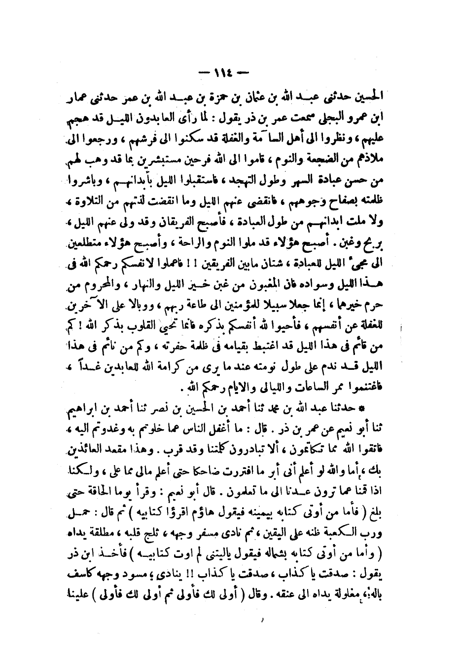 حَدَّثنا عَبْدُ اللهِ بْنُ مُحَمَّدٍ، ثنا أَحْمَدُ بْنُ الْحُسَيْنِ بْنِ نَصْرٍ، ثنا أَحْمَدُ بْنُ إِبْرَاهِيمَ، ثنا أَبُو نُعَيْمٍ، عَنْ عُمَرَ بْنِ ذَرٍّ، قَالَ: §مَا أَغْفَلَ النَّاسَ عَمَّا خَلَوْتُمْ بِهِ، وَغَدَوْتُمْ إِلَيْهِ، فَاتَّقُوا اللهَ مِمَّا تَكَاتَمُونَ، أَلَا تُبَادِرُونَ كَلِمَتَنَا وَقَدْ قَرُبَ، وَهَذَا مَقْعَدُ الْعَائِذِينَ بِكَ، أَمَا وَاللهِ لَوْ أَعْلَمُ أَنِّي أَبَرُّ مَا افْتَرَرْتُ ضَاحِكًا حَتَّى أَعْلَمَ مَا لِي مِمَّا عَلَيَّ، وَلَكِنَّا إِذَا قُمْنَا عَمَّا تَرَوْنَ عُدْنَا إِلَى مَا تَعْلَمُونَ، قَالَ أَبُو نُعَيْمٍ: وَقَرَأَ يَوْمًا الْحَاقَّةَ حَتَّى بَلَغَ {فَأَمَّا مَنْ أُوتِيَ كِتَابَهُ بِيمِينِهِ فَيَقُولُ هَاؤُمُ اقْرَءُوا كِتَابِيَهْ}، ثُمَّ قَالَ: حُمِلَ وَرَبِّ الْكَعْبَةِ ظَنُّهُ عَلَى الْيقِينِ، ثُمَّ نَادَى مُسْفِرٌ وَجْهُهُ، ثَلْجٌ قَلْبُهُ، مُطْلَقَةٌ يَدَاهُ: {وَأَمَّا مَنْ أُوتِيَ كِتَابَهُ بِشِمَالِهِ فَيَقُولُ يَا لَيْتَنِي لَمْ أُوتَ كِتَابِيَهْ} [الحاقة: 25]، فَأَخَذَ ابْنُ ذَرٍّ يَقُولُ: صَدَقْتَ يَا كَذَّابُ، يَنَادِي مُسْوَدٌّ وَجْهُهُ، كَاسِفٌ بَالُهُ، مَغْلُولَةٌ يَدَاهُ إِلَى عُنُقِهِ، وَقَالَ: {أَوْلَى لَكَ فَأَوْلَى ثُمَّ أَوْلَى لَكَ فَأَوْلَى} [القيامة: 35] عَلَيْنَا تَكَرَّرَ -[115]- الْوَعِيدُ، فَلَا وَعِزَّتِكَ مَا نَحْتَمِلُ وَعِيدَ مَنْ هُوَ دُونَكَ مِمَّنْ لَا يَضُرُّ وَلَا يَنْفَعُ، مِمَّنْ يُشْرِكُنَا فِي لَذَّةِ نَوْمِنَا وَطَعَامِنَا وَشَرَابِنَا حَتَّى نَعْلَمَ مَا لَنَا فِيمَا وُعِدْنَا، اللهُمَّ هَؤُلَاءِ الَّذِينَ اغْتَنَمُوا ظُلْمَةَ اللَّيْلِ وَجَاهَدُوكَ بِمَا اسْتَخْفَوْا بِهِ مِنْ غَيْرِكَ، فَإِنْ كَانَ فِي سَابِقِ الْعِلْمِ أَلَّا يُحْدِثُوا تَوْبَةً فَأَقِدْ مِنْهُمْ بِأَسْوَإِ أَعْمَالِهِمْ