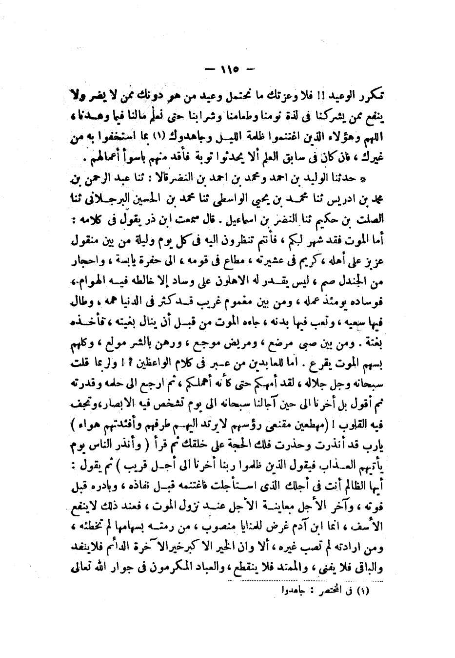 حَدَّثَنَا الْوَلِيدُ بْنُ أَحْمَدَ، وَمُحَمَّدُ بْنُ أَحْمَدَ بْنِ النَّضْرِ، قَالَا: ثنا عَبْدُ الرَّحْمَنِ بْنُ مُحَمَّدِ بْنِ إِدْرِيسَ، ثنا مُحَمَّدُ بْنُ يَحْيَى الْوَاسِطِيُّ، ثنا مُحَمَّدُ بْنُ الْحُسَيْنِ الْبُرْجُلَانِيُّ، ثنا الصَّلْتُ بْنُ حَكِيمٍ، ثنا النَّضْرُ بْنُ إِسْمَاعِيلَ، قَالَ: سَمِعْتُ ابْنَ ذَرٍّ، يَقُولُ فِي كَلَامِهِ: §أَمَّا الْمَوْتُ فَقَدْ شُهِرَ لَكُمْ، فَأَنْتُمْ تَنْظُرُونَ إِلَيْهِ فِي كُلِّ يَوْمٍ وَلَيْلَةٍ مِنْ بَيْنِ مَنْقُولٍ عَزِيزٍ عَلَى أَهْلِهِ، كَرِيمٍ فِي عَشِيرَتِهِ، مُطَاعٍ فِي قَوْمِهِ، إِلَى حُفْرَةٍ يَابِسَةٍ، وَأَحْجَارٍ مِنَ الْجَنْدَلِ صُمٍّ، لَيْسَ يَقْدِرُ لَهُ الْأَهْلُونَ عَلَى وَسَادٍ إِلَّا خَالَطَهُ فِيهِ الْهَوَامُّ، فَوِسَادُهُ يَوْمَئِذٍ عَمَلُهُ، وَمِنْ بَيْنِ مَغْمُومٍ غَرِيبٍ، قَدْ كَثُرَ فِي الدُّنْيَا هَمُّهُ، وَطَالَ فِيهَا سَعْيُهُ، وَتَعِبَ فِيهَا بَدَنُهُ، جَاءَهُ الْمَوْتُ مِنْ قَبْلِ أَنْ يَنَالَ بُغْيَتَهُ، فَأَخَذَهُ بَغْتَةً، وَمِنْ بَيْنِ صَبِيٍّ مُرْضَعٍ، وَمَرِيضٍ مُوجَعٍ، وَوَهَنٍ بِالشَّرِّ مُولَعٍ، وَكُلُّهُمْ بِسَهْمِ الْمَوْتِ يُقْرَعُ، أَمَا لِلْعَابِدِينَ مِنْ عِبَرٍ فِي كَلَامِ الْوَاعِظِينَ؟ وَلَرُبَّمَا قُلْتُ: سُبْحَانَهُ وَجَلَّ جَلَالُهُ، لَقَدْ أَمْهَلَكُمْ حَتَّى كَأَنَّهُ أَهْمَلَكُمْ، ثُمَّ أَرْجِعُ إِلَى حِلْمِهِ وَقُدْرَتِهِ ثُمَّ أَقُولُ: بَلْ أَخَّرْنَا إِلَى حِينِ آجَالِنَا سُبْحَانَهُ، إِلَى يَوْمٍ تَشْخَصُ فِيهِ الْأَبْصَارُ، وَتَجِفُّ فِيهِ الْقُلُوبُ {مُهْطِعِينَ مُقْنِعِي رُءُوسِهِمْ لَا يَرْتَدُّ إِلَيْهِمْ طَرْفُهُمْ وَأَفْئِدَتُهُمْ هَوَاءٌ} [إبراهيم: 43]، يَا رَبِّ قَدْ أَنْذَرْتَ وَحَذَّرْتَ، فَلَكَ الْحُجَّةُ عَلَى خَلْقِكَ، ثُمَّ قَرَأَ {وَأَنْذِرِ النَّاسَ يَوْمَ يَأْتِيهِمُ الْعَذَابُ فَيَقُولُ الَّذِينَ ظَلَمُوا رَبَّنَا أَخِّرْنَا إِلَى أَجْلٍ قَرِيبٍ} [إبراهيم: 44]، ثُمَّ يَقُولُ: أَيُّهَا الظَّالِمُ أَنْتَ فِي أَجَلِكَ الَّذِي اسْتَأْجَلْتَ، فَاغْتَنِمْهُ قَبْلَ نَفَاذِهِ، وَبَادِرْهُ قَبْلَ فَوْتِهِ، وَآخِرُ الْأَجَلِ مُعَاينَةُ الْأَجَلِ عِنْدَ نُزُولِ الْمَوْتِ، فَعِنْدَ ذَلِكَ لَا يَنْفَعُ الْأَسَفُ، إِنَّمَا ابْنُ آدَمَ غَرَضٌ لِلْمَنَايَا مَنْصُوبٌ مَنْ رَمَتْهُ بِسِهَامِهَا لَمْ تُخْطِئُهُ، وَمَنْ أَرَادَتْهُ لَمْ تُصِبْ غَيْرَهُ، أَلَا وَإِنَّ الْخَيْرَ الْأَكْبَرَ خَيْرُ الْآخِرَةِ الدَّائِمُ فَلَا يَنْفَدُ، وَالْبَاقِي فَلَا يَفْنَى، وَالْمُمْتَدُّ فَلَا يَنْقَطِعُ، وَالْعِبَادُ الْمُكْرَمُونَ فِي جِوَارِ اللهِ تَعَالَى -[116]-، مُقِيمُونَ فِي كُلِّ مَا اشْتَهَتِ الْأَنْفُسُ، وَلَذَّتِ الْأَعْيُنُ، مُتَزَاوِرُونَ عَلَى النَّجَائِبِ، وَيَتَلَاقَوْنَ فَيَتَذَاكَرُونَ أَيَّامَ الدُّنْيَا، هَنِيئًا لِلْقَوْمِ، هَنِيئًا لَقَدْ وَجَدَ الْقَوْمُ بُغْيَتَهُمْ، وَنَالُوا طِلْبَتَهُمْ، إِذْ كَانَ رَغْبَتُهُمْ إِلَى السَّيِّدِ الْكَرِيمِ الْمُتَفَضِّلِ