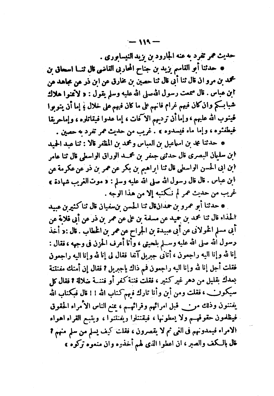 حَدَّثَنَا أَبُو عَمْرِو بْنُ حَمْدَانَ، ثنا الْحَسَنُ بْنُ سُفْيَانَ، ثنا كَثِيرُ بْنُ عُبَيْدٍ الْحَذَّاءُ، ثنا مُحَمَّدُ بْنُ حُمَيْدٍ، عَنْ مَسْلَمَةَ بْنِ عُلَيٍّ، عَنْ عُمَرَ بْنِ ذَرٍّ، عَنْ أَبِي قِلَابَةَ، عَنْ أَبِي مُسْلِمٍ الْخَوْلَانِيِّ، عَنْ أَبِي عُبَيْدَةَ بْنِ الْجَرَّاحِ، عَنْ عُمَرَ بْنِ الْخَطَّابِ، قَالَ: أَخَذَ رَسُولُ اللهِ صَلَّى اللهُ عَلَيْهِ وَسَلَّمَ بِلِحْيَتِي وَأَنَا أَعْرِفُ الْحُزْنَ فِي وَجْهِهِ فَقَالَ: " §إِنَّا لِلَّهِ وَإِنَّا إِلَيْهِ رَاجِعُونَ، أَتَانِي جِبْرِيلُ آنِفًا فَقَالَ لِي: إِنَّا لِلَّهِ وَإِنَّا إِلَيْهِ رَاجِعُونَ، فَقُلْتُ: أَجَلْ، إِنَّا لِلَّهِ وَإِنَّا إِلَيْهِ رَاجِعُونَ، فَمِمَّ ذَاكَ يَا جِبْرِيلُ؟ فَقَالَ: إِنَّ أُمَّتَكَ مُفْتَتَنَةٌ بَعْدَكَ بِقَلِيلٍ مِنْ دَهْرٍ غَيْرِ كَثِيرٍ، فَقُلْتُ: فِتْنَةُ كُفْرٍ أَوْ فِتْنَةُ ضَلَالَةٍ؟ فَقَالَ: كُلٌّ سَيكُونُ، فَقُلْتُ: وَمِنْ أَيْنَ وَأَنَا تَارِكٌ فِيهِمْ كِتَابَ اللهِ؟ قَالَ: فَبِكِتَابِ اللهِ يُفْتَنُونَ، وَذَلِكَ مِنْ قِبَلِ أُمَرَائِهِمْ وَقُرَّائِهِمْ، يَمْنَعُ النَّاسَ الْأُمَرَاءُ الْحُقُوقَ، فَيَظْلِمُونَ حُقُوقَهُمْ وَلَا يُعْطُونَهَا، فَيَقْتَتِلُوا وَيَفْتَتِنُوا، وَيَتَّبِعُ الْقُرَّاءُ أَهْوَاءَ الْأُمَرَاءِ فَيَمُدُّونَهُمْ فِي الْغَيِّ ثُمَّ لَا يُقْصِرُونَ، فَقُلْتُ: كَيْفَ يَسْلَمُ مَنْ سَلِمَ مِنْهُمْ؟ قَالَ: بِالْكَفِّ وَالصَّبْرِ، إِنْ أُعْطُوا الَّذِي لَهُمْ أَخَذُوهُ، وَإِنْ مُنِعُوهُ تَرَكُوهُ "