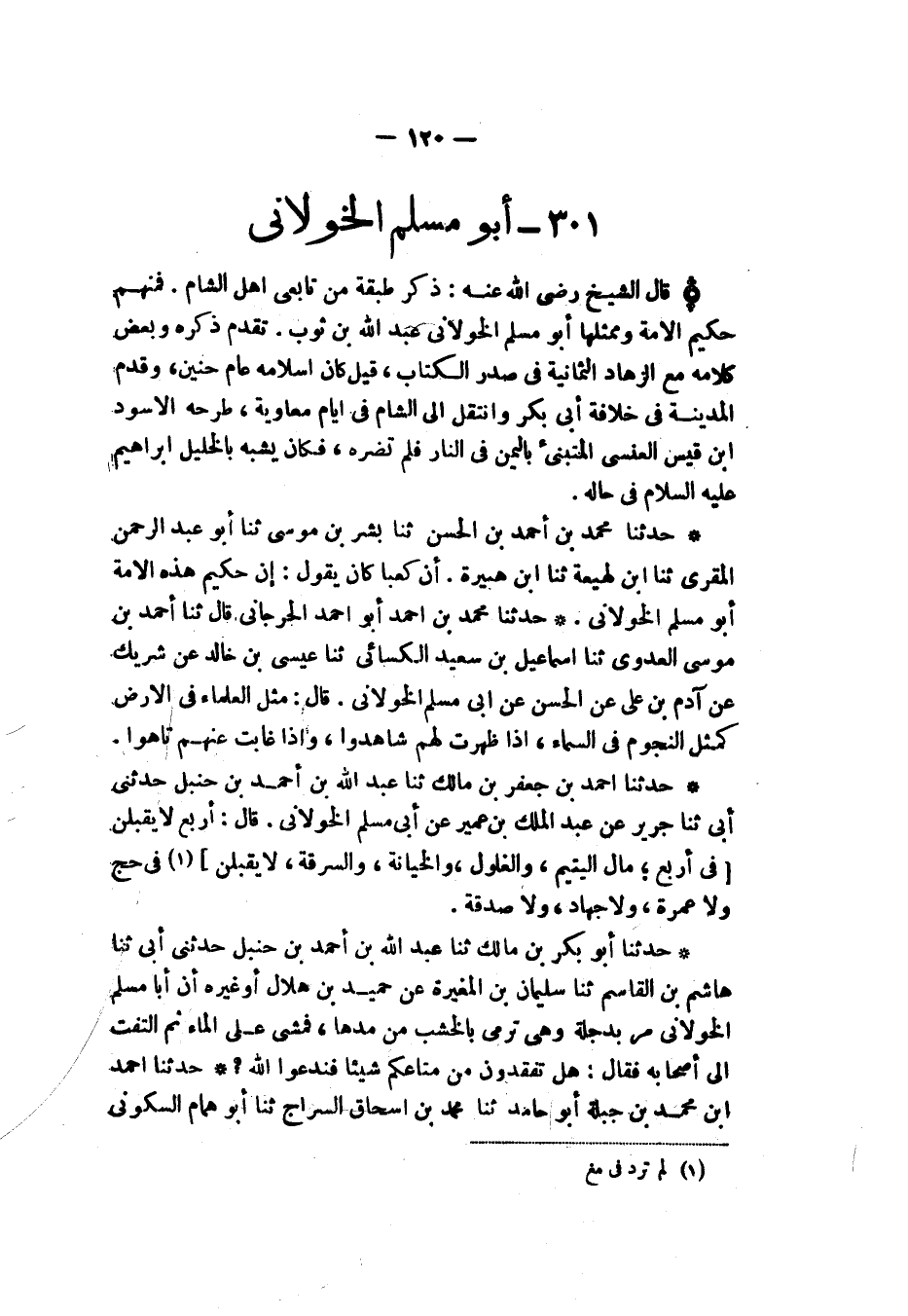 §أَبُو مُسْلِمٍ الْخَوْلَانِيُّ قَالَ الشَّيْخُ رَحِمَهُ اللهُ تَعَالَى وَرَضِيَ اللهُ عَنْهُ: ذِكْرُ طَبَقَةٍ مِنْ تَابِعِي أَهْلِ الشَّامِ. فَمِنْهُمْ حَكِيمُ الْأُمَّةِ وَمُمَثِّلُهَا أَبُو مُسْلِمٍ الْخَوْلَانِيُّ عَبْدُ اللهِ بْنُ ثَوْبٍ، تَقَدَّمَ ذِكْرُهُ وَبَعْضُ كَلَامِهِ مَعَ الزُّهَّادِ الثَّمَانِيَةِ فِي صَدْرِ الْكِتَابِ، قِيلَ: كَانَ إِسْلَامُهُ عَامَ حُنَيْنٍ، وَقَدِمَ الْمَدِينَةَ فِي خِلَافَةِ أَبِي بَكْرٍ، وَانْتَقَلَ إِلَى الشَّامِ فِي أَيَّامِ مُعَاوِيَةَ، طَرَحَهُ الْأَسْوَدُ الْعَنْسِيُّ الْمُتَنَبِّئُ بِالْيمَنِ فِي النَّارِ فَلَمْ تَضُرَّهُ، فَكَانَ يُشَبَّهُ بِالْخَلَيلِ إِبْرَاهِيمَ عَلَيْهِ السَّلَامُ فِي حَالِهِ