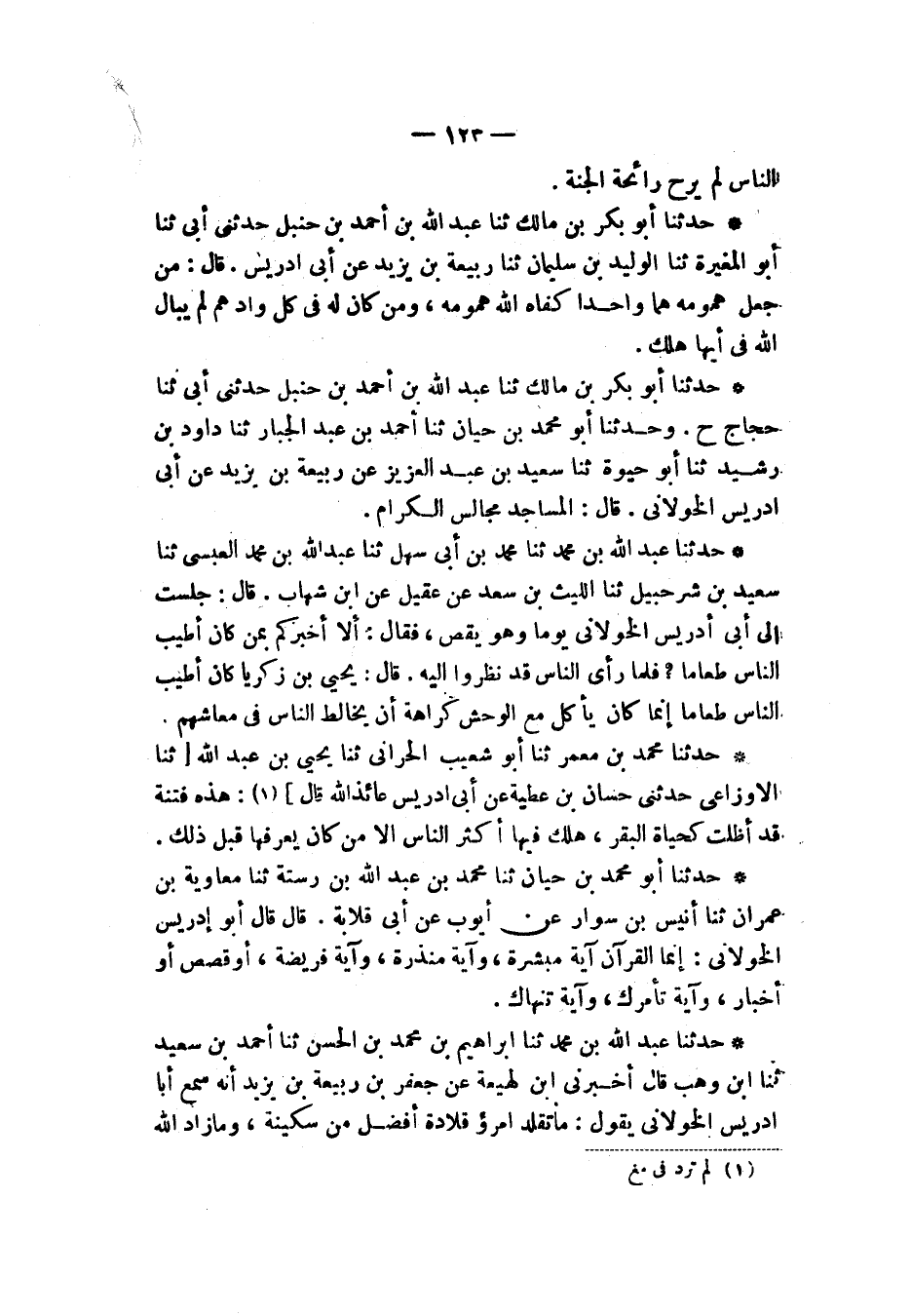 حَدَّثَنَا أَبُو بَكْرِ بْنُ مَالِكٍ، ثنا عَبْدُ اللهِ بْنُ أَحْمَدَ بْنِ حَنْبَلٍ، حَدَّثَنِي أَبِي، ثنا حَجَّاجٌ، ح. وَحَدَّثَنَا أَبُو مُحَمَّدِ بْنُ حَيَّانَ، ثنا أَحْمَدُ بْنُ عَبْدِ الْجَبَّارِ، ثنا دَاوُدُ بْنُ رُشَيْدٍ، ثنا أَبُو حَيْوَةَ، ثنا سَعِيدُ بْنُ عَبْدِ الْعَزِيزِ، عَنْ رَبِيعَةَ بْنِ يَزِيدَ، عَنْ أَبِي إِدْرِيسَ الْخَوْلَانِيِّ قَالَ: «§الْمَسَاجِدُ مَجَالِسُ الْكِرَامِ»