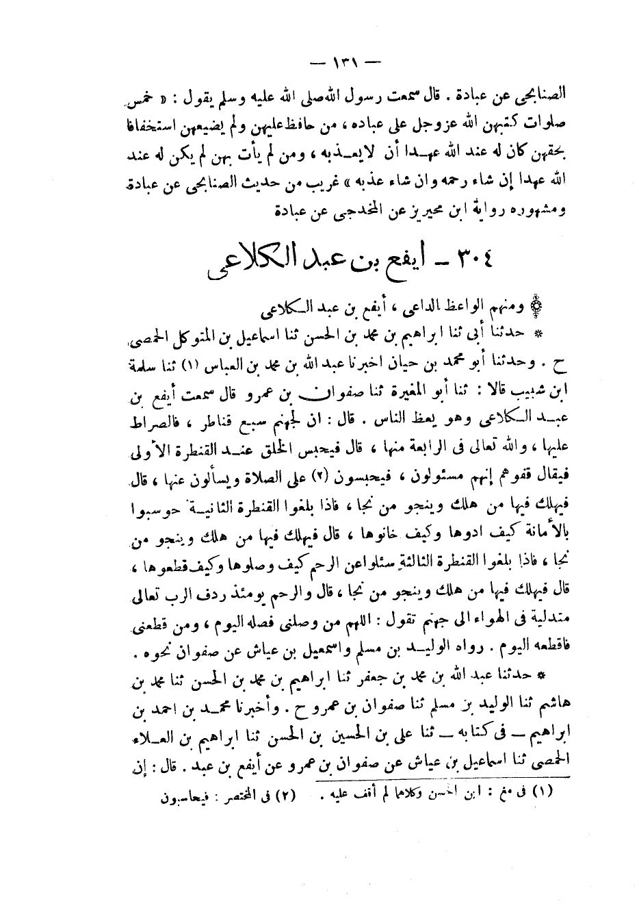 حَدَّثَنَا أَبِي، ثنا إِبْرَاهِيمُ بْنُ مُحَمَّدِ بْنِ الْحَسَنِ، ثنا إِسْمَاعِيلُ بْنُ الْمُتَوَكِّلِ الْحِمْصِيُّ، ح. وَحَدَّثَنَا أَبُو مُحَمَّدِ بْنُ حَيَّانَ، أَخْبَرَنَا عَبْدُ اللهِ بْنُ مُحَمَّدِ بْنِ الْعَبَّاسِ، ثنا سَلَمَةُ بْنُ شَبِيبٍ قَالَا: ثنا أَبُو الْمُغِيرَةِ، ثنا صَفْوَانُ بْنُ عَمْرٍو قَالَ: سَمِعْتُ أَيْفَعَ بْنَ عَبْدٍ الْكَلَاعِيَّ، وَهُوَ يَعِظُ النَّاسَ قَالَ: §إِنَّ لِجَهَنَّمَ سَبْعُ قَنَاطِرَ، فَالصِّرَاطُ عَلَيْهَا، وَاللهُ تَعَالَى فِي الرَّابِعَةِ مِنْهَا، قَالَ: فَيُحْبَسُ الْخَلْقُ عِنْدَ الْقَنْطَرَةِ الْأُولَى، فَيُقَالُ: {قِفُوهُمْ إِنَّهُمْ مَسْئُولُونَ} [الصافات: 24] فَيُحْبَسُونَ عَلَى الصَّلَاةِ وَيُسْأَلُونَ عَنْهَا، قَالَ: فَيهْلِكُ فِيهَا مَنْ هَلَكَ، وَينْجُو مَنْ نَجَا، فَإِذَا بَلَغُوا الْقَنْطَرَةَ الثَّانِيَةَ حُوسِبُوا بِالْأَمَانَةِ كَيْفَ أَدَّوْهَا، وَكَيْفَ خَانُوهَا، قَالَ: فَيهْلِكُ فِيهَا مَنْ هَلَكَ، وَينْجُو مَنْ نَجَا، فَإِذَا بَلَغُوا الْقَنْطَرَةَ الثَّالِثَةَ سُئِلُوا عَنِ الرَّحِمِ، كَيْفَ وَصَلُوهَا، وَكَيْفَ قَطَعُوهَا، قَالَ: فَيهْلِكُ فِيهَا مَنْ هَلَكَ، وَينْجُو مَنْ نَجَا، قَالَ وَالرَّحِمُ يَوْمَئِذٍ رِدْفُ الرَّبِّ تَعَالَى، مُتَدَلِّيَةٌ فِي الْهَوَاءِ إِلَى جَهَنَّمَ تَقُولُ: اللهُمَّ مَنْ وَصَلَنِي فَصِلْهُ الْيوْمَ، وَمَنْ قَطَعَنِي فَاقْطَعْهُ الْيوْمَ " رَوَاهُ الْوَلِيدُ بْنُ مُسْلِمٍ، وَإِسْمَاعِيلُ بْنُ عَيَّاشٍ، عَنْ صَفْوَانَ نَحْوَهُ