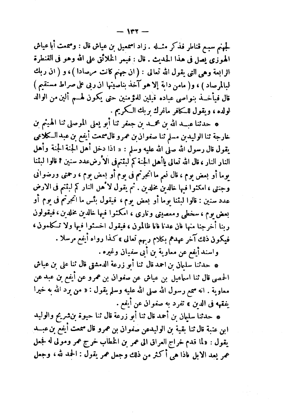 حَدَّثنا عَبْدُ اللهِ بْنُ مُحَمَّدِ بْنِ جَعْفَرٍ، ثنا أَبُو يَعْلَى الْمَوْصِلِيُّ، ثنا الْهَيْثَمُ بْنُ خَارِجَةَ، ثنا الْوَلِيدُ بْنُ مُسْلِمٍ، ثنا صَفْوَانُ بْنُ عَمْرٍو قَالَ: سَمِعْتُ أَيْفَعَ بْنَ عَبْدٍ الْكَلَاعِيَّ، يَقُولُ: قَالَ رَسُولُ اللهِ صَلَّى اللهُ عَلَيْهِ وَسَلَّمَ: " §إِذَا دَخَلَ أَهْلُ الْجَنَّةِ الْجَنَّةَ، وَأَهْلُ النَّارِ النَّارَ، قَالَ اللهُ تَعَالَى: يَا أَهْلَ الْجَنَّةِ، كَمْ لَبِثْتُمْ فِي الْأَرْضِ عَدَدَ سِنِينَ؟ قَالُوا: لَبِثْنَا يَوْمًا أَوْ بَعْضَ يَوْمٍ، قَالَ: نَعَمْ، مَا اتَّجَرْتُمْ فِي يَوْمٍ أَوْ بَعْضِ يَوْمٍ، رَحْمَتِي وَرِضْوَانِي وَجَنَّتِي، امْكُثُوا فِيهَا خَالِدِينَ مُخَلَّدِينَ، ثُمَّ يَقُولُ لِأَهْلِ النَّارِ: {كَمْ لَبِثْتُمْ فِي الْأَرْضِ عَدَدَ سِنِينَ قَالُوا لَبِثْنَا يَوْمًا أَوْ بَعْضَ يَوْمٍ} [المؤمنون: 113]، فَيَقُولُ: بِئْسَ مَا اتَّجَرْتُمْ فِي يَوْمٍ أَوْ بَعْضِ يَوْمٍ، سُخْطِي وَمَعْصِيَتِي وَنَارِي، امْكُثُوا فِيهَا خَالِدِينَ مُخَلَّدِينَ فَيقُولُونَ: {رَبَّنَا أَخْرِجْنَا مِنْهَا، فَإِنْ عُدْنَا فَإِنَّا ظَالِمُونَ} [المؤمنون: 107] فَيَقُولُ: {اخْسَئُوا فِيهَا وَلَا تُكَلِّمُونَ}، فَيكُونُ ذَلِكَ آخِرَ عَهْدِهِمْ بِكَلَامِ رَبِّهِمْ تَعَالَى " كَذَا رَوَاهُ أَيْفَعُ مُرْسَلًا وَأَسْنَدَ أَيْفَعُ عَنْ مُعَاوِيَةَ بْنِ أَبِي سُفْيَانَ، وَغَيْرِهِ