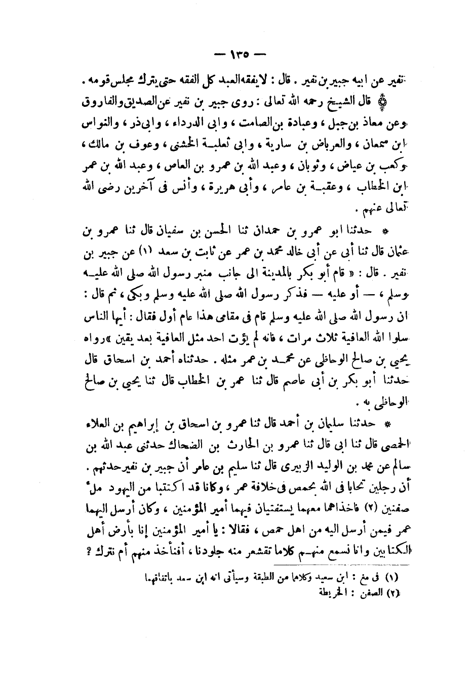 حَدَّثَنَا سُلَيْمَانُ بْنُ أَحْمَدَ، قَالَ: ثنا عَمْرُو بْنُ إِسْحَاقَ بْنِ إِبْرَاهِيمَ بْنِ الْعَلَاءِ الْحِمْصِيُّ، قَالَ: ثنا أَبِي قَالَ: ثنا عَمْرُو بْنُ الْحَارِثِ بْنِ الضَّحَّاكِ، حَدَّثَنِي عَبْدُ اللهِ بْنُ سَالِمٍ، عَنْ مُحَمَّدِ بْنِ الْوَلِيدِ الزُّبَيْرِيِّ، قَالَ: ثنا سُلَيْمُ بْنُ عَامِرٍ، أَنَّ جُبَيْرَ بْنَ نُفَيْرٍ، حَدَّثَهُمْ: أَنَّ رَجُلَيْنِ تَحَابَّا فِي اللهِ بِحِمْصَ فِي خِلَافَةِ عُمَرَ، وَكَانَا قَدِ اكْتَتَبَا مِنَ الْيهُودِ مِلْءَ صِفْنَيْنِ، فَأَخَذَاهُمَا مَعَهُمَا يَسْتَفْتِيَانِ فِيهِمَا أَمِيرَ الْمُؤْمِنِينَ، وَكَانَ أَرْسَلَ إِلَيْهِمَا عُمَرُ فِيمَنْ أَرْسَلَ إِلَيْهِ مِنْ أَهْلِ حِمْصٍ فَقَالَا: يَا أَمِيرَ الْمُؤْمِنِينَ، إِنَّا بِأَرْضِ أَهْلِ الْكِتَابَيْنِ، وَإِنَّا نَسْمَعُ مِنْهُمْ كَلَامًا تَقْشَعِرُّ مِنْهُ جُلُودُنَا، أَفَنَأْخُذُ مِنْهُمْ أَمْ نَتْرُكُ؟ -[136]- قَالَ: لَعَلَّكُمَا اكْتَتَبْتُمَا مِنْهُ شَيْئًا؟ فَقَالَا: لَا، قَالَ: سَأُحِدِّثُكُمَا: إِنِّي انْطَلَقْتُ فِي حَيَاةِ النَّبِيِّ صَلَّى اللهُ عَلَيْهِ وَسَلَّمَ حَتَّى أَتَيْتُ خَيْبَرَ، فَوَجَدْتُ يَهُودِيًّا يَقُولُ قَوْلًا أَعْجَبَنِي، فَقُلْتُ: هَلْ أَنْتَ مُكْتِبِي مِمَّا تَقُولُ؟ قَالَ: نَعَمْ، قَالَ: فَأَتَيْتُهُ بِأَدِيمِ ثَنِيَّةٍ أَوْ جَذَعَةٍ، فَأَخَذَ يُمْلِي عَلِيَّ حَتَّى كَتَبْتُ فِي الْأَكْرُعِ رَغْبَةً فِي قَوْلِهِ، فَلَمَّا رَجَعْتُ قُلْتُ: يَا رَسُولَ اللهِ، إِنِّي لَقِيتُ يَهُودِيًّا يَقُولُ قَوْلًا لَمْ أَسْمَعْ مِثْلَهُ بَعْدَكَ، قَالَ: «لَعَلَّكَ كَتَبْتَ مِنْهُ؟» قُلْتُ: نَعَمْ، قَالَ: «ائْتِنِي بِهِ» فَانْطَلَقْتُ أَرْغَبُ عَنِ الْمَشْيِ رَجَاءَ أَنْ أَكُونَ جِئْتُ نَبِيَّ اللهِ صَلَّى اللهُ عَلَيْهِ وَسَلَّمَ بِبَعْضِ مَا يُحِبُّهُ، فَلَمَّا أَتَيْتُهُ قَالَ: «اجْلِسْ فَاقْرَأْ عَلِيَّ» فَقَرَأْتُ سَاعَةً، ثُمَّ نَظَرْتُ إِلَى وَجْهِهِ صَلَّى اللهُ عَلَيْهِ وَسَلَّمَ فَإِذَا هُوَ يَتَلَوَّنُ فَصِرْتُ مِنَ الْفَرَقِ لَا أُجِيزُ حَرْفًا مِنْهُ، فَلَمَّا رَأَى الَّذِي بِي دَفَعْتُهُ إِلَيْهِ، ثُمَّ جَعَلَ يَتَتَبَّعُهُ رَسْمًا رَسْمًا فَيَمْحُوهُ بَرِيقِهِ، وَهُوَ يَقُولُ: «§لَا تَتَّبِعُوا هَؤُلَاءِ فَإِنَّهُمْ قَدْ هَوَّكُوا وَتَهَوَّكُوا» حَتَّى مَحَا آخِرَهُ حَرْفًا حَرْفًا، قَالَ عُمَرُ: فَلَوْ أَعْلَمُ أَنَّكُمَا اكْتَتَبْتُمَا مِنْهُمْ شَيْئًا جَعَلْتُكُمَا نَكَالًا لِهَذِهِ الْأُمَّةِ، قَالَا: لَا وَاللهِ لَا نَكْتُبُ مِنْهُمْ شَيْئًا أَبَدًا، فَخَرَجَا بِصَفْنَيْهِمَا فَحَفَرَا لَهُمَا مِنَ الْأَرْضِ فَلَمْ يَأْلُوا أَنْ يُعَمِّقَا وَدَفَنَا، فَكَانَ آخِرَ الْعَهْدِ مِنْهُمَا