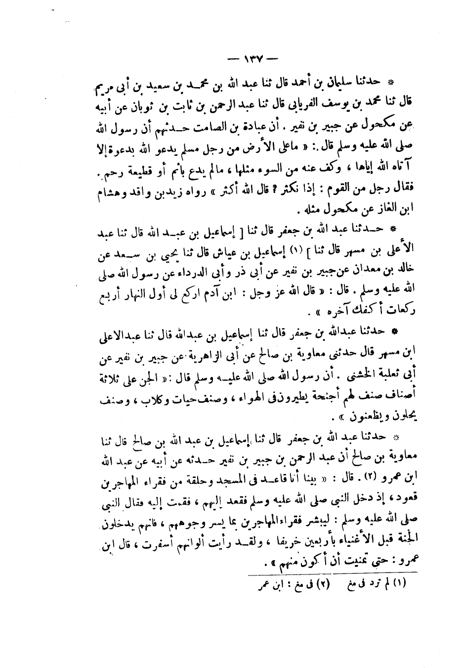 حَدَّثَنَا عَبْدُ اللهِ بْنُ جَعْفَرٍ، قَالَ: ثنا إِسْمَاعِيلُ بْنُ عَبْدِ اللهِ بْنِ صَالِحٍ، قَالَ: ثنا مُعَاوِيَةُ بْنُ صَالِحٍ، أَنَّ عَبْدَ الرَّحْمَنِ بْنَ جُبَيْرِ بْنِ نُفَيْرٍ حَدَّثَهُ، عَنْ أَبِيهِ، عَنْ عَبْدِ اللهِ بْنِ عَمْرٍو، قَالَ: بَيْنَا أَنَا قَاعِدٌ، فِي الْمَسْجِدِ، وَحَلْقَةٌ مِنْ فُقَرَاءِ الْمُهَاجِرِينَ قُعُودٌ إِذْ دَخَلَ النَّبِيُّ صَلَّى اللهُ عَلَيْهِ وَسَلَّمَ فَقَعَدَ إِلَيْهِمْ، فَقُمْتُ إِلَيْهِ فَقَالَ النَّبِيُّ صَلَّى اللهُ عَلَيْهِ وَسَلَّمَ: «§لِيُبْشِرْ فُقَرَاءُ الْمُهَاجِرِينَ بِمَا يَسُرُّ وُجُوهَهُمْ، فَإِنَّهُمْ يَدْخُلُونَ الْجَنَّةَ قَبْلَ الْأَغْنِيَاءِ بِأَرْبَعِينَ خَرِيفًا، وَلَقَدْ رَأَيْتُ أَلْوَانَهُمْ أَسْفَرَتْ»، قَالَ ابْنُ عَمْرٍو: حَتَّى تَمَنَّيْتُ أَنْ أَكُونَ مِنْهُمْ