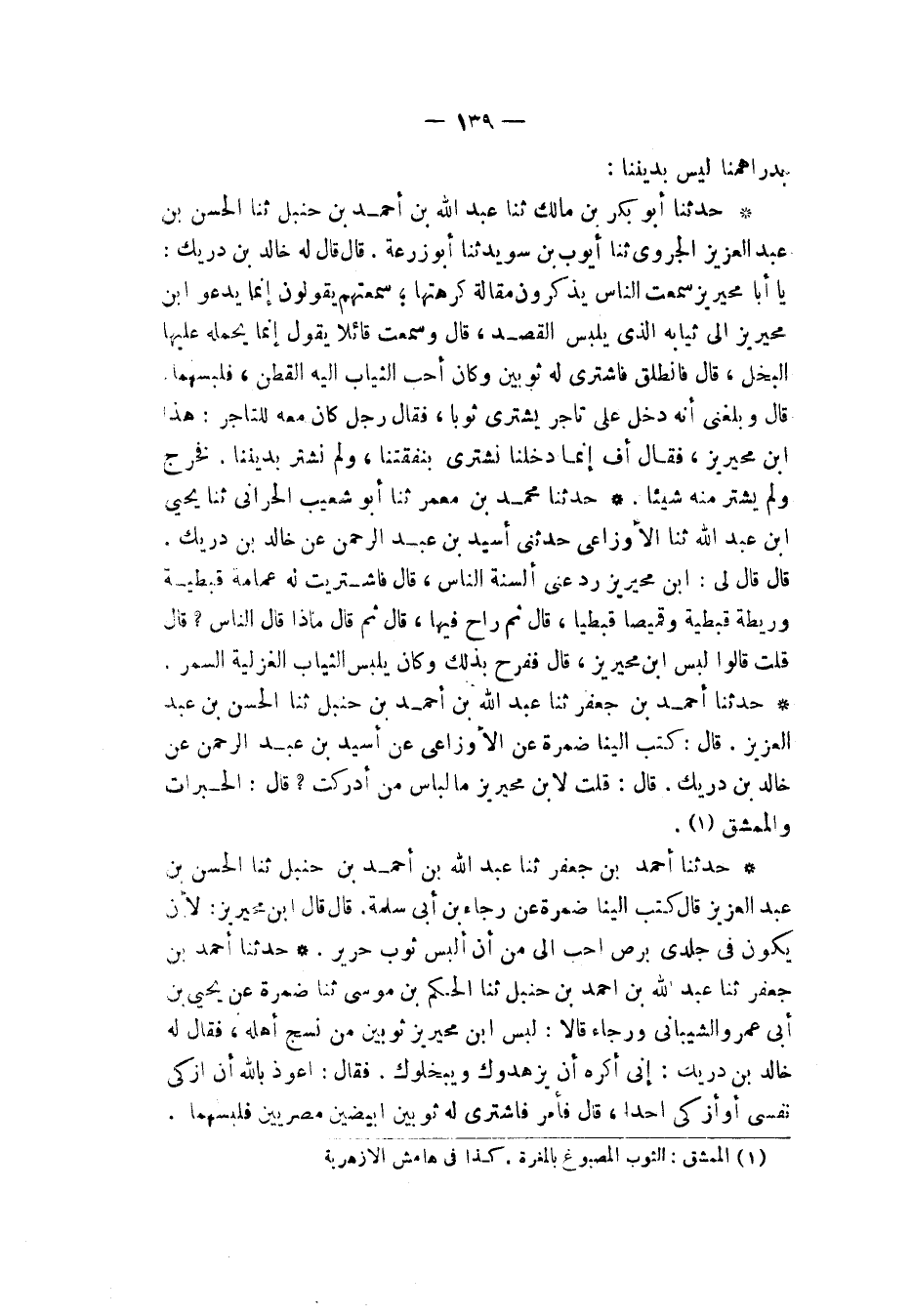 حَدَّثَنَا أَحْمَدُ بْنُ جَعْفَرٍ، ثنا عَبْدُ اللهِ بْنُ أَحْمَدَ بْنِ حَنْبَلٍ، ثنا الْحَسَنُ بْنُ عَبْدِ الْعَزِيزِ، قَالَ: كَتَبَ إِلَيْنَا ضَمْرَةُ، عَنِ الْأَوْزَاعِيِّ، عَنْ أُسَيْدِ بْنِ عَبْدِ الرَّحْمَنِ، عَنْ خَالِدِ بْنِ دُرَيْكٍ قَالَ: قُلْتُ لِابْنِ مُحَيْرِيزٍ §مَا لِبَاسُ مَنْ أَدْرَكْتَ؟ قَالَ: الْحِبَرَاتُ وَالْمُمَشَّقُ