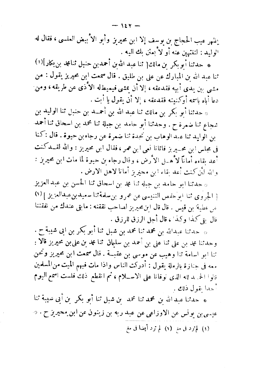 حَدَّثَنَا عَبْدُ اللهِ بْنُ مُحَمَّدٍ، ثنا مُحَمَّدُ بْنُ شِبْلٍ، ثنا أَبُو بَكْرِ بْنُ أَبِي شَيْبَةَ، ثنا عِيسَى بْنُ يُونُسَ، عَنِ الْأَوْزَاعِيِّ، عَنْ عَبْدِ رَبِّهِ بْنِ زَيْتُونٍ، عَنِ ابْنِ مُحَيْرِيزٍ، ح -[143]-. وَحَدَّثَنَا عَبْدُ اللهِ بْنُ مُحَمَّدِ بْنِ جَعْفَرٍ، ثنا عَلِيُّ بْنُ إِسْحَاقَ، ثنا الْحُسَيْنُ بْنُ الْحَسَنِ، ثنا عَبْدُ اللهِ بْنُ الْمُبَارَكِ، أَنْبَأَنَا ثَوْرُ بْنُ يَزِيدَ، عَنْ عَبْدِ رَبِّهِ بْنِ سُلَيْمَانَ، عَنْ عَبْدِ اللهِ بْنِ مُحَيْرِيزٍ، قَالَ: " §كُلُّ كَلَامٍ فِي الْمَسْجِدِ لَغْوٌ إِلَّا كَلَامُ ثَلَاثَةٍ: مُصَلٍّ، أَوْ ذَاكِرٍ، أَوْ سَائِلِ حَقٍّ أَوْ مُعْطِيهِ "