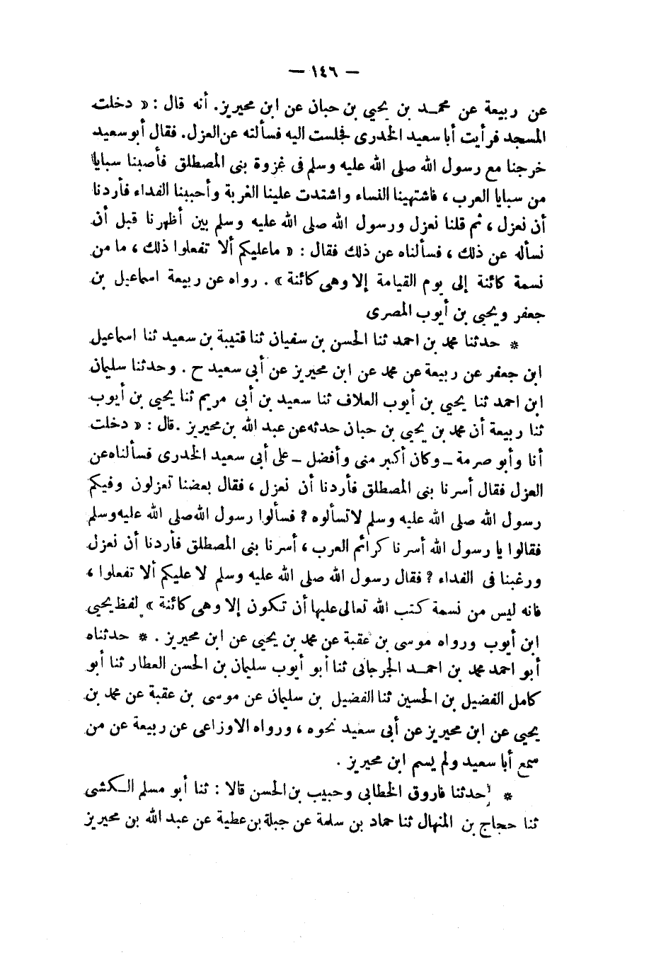 حَدَّثَنَا مُحَمَّدُ بْنُ أَحْمَدَ، ثنا الْحَسَنُ بْنُ سُفْيَانَ، ثنا قُتَيْبَةُ بْنُ سَعِيدٍ، ثنا إِسْمَاعِيلُ بْنُ جَعْفَرٍ، عَنْ رَبِيعَةَ، عَنْ مُحَمَّدٍ، عَنِ ابْنِ مُحَيْرِيزٍ، عَنْ أَبِي سَعِيدٍ، ح. وَحَدَّثَنَا سُلَيْمَانُ بْنُ أَحْمَدَ، ثنا يَحْيَى بْنُ أَيُّوبَ الْعَلَّافُ، ثنا سَعِيدُ بْنُ أَبِي مَرْيمَ، ثنا يَحْيَى بْنُ أَيُّوبَ، ثنا رَبِيعَةُ، أَنَّ مُحَمَّدَ بْنَ يَحْيَى بْنِ حَبَّانَ حَدَّثَهُ، عَنْ عَبْدَ اللهِ بْنَ مُحَيْرِيزٍ قَالَ: دَخَلْتُ أَنَا وَأَبُو صِرْمَةَ، وَكَانَ أَكْبَرَ وَأَفْضَلَ، عَلَى أَبِي سَعِيدٍ الْخُدْرِيِّ، فَسَأَلْنَاهُ عَنِ الْعَزْلِ، فَقَالَ: أَسَرْنَا بَنِي الْمُصْطَلِقِ، فَأَرَدْنَا أَنْ نَعْزِلَ، فَقَالَ بَعْضُنَا: تَعْزِلُونَ وَفِيكُمْ رَسُولُ اللهِ صَلَّى اللهُ عَلَيْهِ وَسَلَّمَ لَا تَسْأَلُوهُ؟ فَسَأَلُوا رَسُولَ اللهِ صَلَّى اللهُ عَلَيْهِ وَسَلَّمَ فَقَالُوا: يَا رَسُولَ اللهِ، أَسَرْنَا كَرَائِمَ الْعَرَبِ، أَسَرْنَا بَنِي الْمُصْطَلِقِ فَأَرَدْنَا أَنْ نَعْزِلَ، وَرَغِبْنَا فِي الْفِدَاءِ؟ فَقَالَ رَسُولُ اللهِ صَلَّى اللهُ عَلَيْهِ وَسَلَّمَ: «لَا عَلَيْكُمْ أَلَّا تَفْعَلُوا، فَإِنَّهُ §لَيْسَ مِنْ نَسَمَةٍ كَتَبَ اللهُ تَعَالَى عَلَيْهَا أَنْ تَكُونَ إِلَّا وَهِيَ كَائِنَةٌ». لَفْظُ يَحْيَى بْنِ أَيُّوبَ. وَرَوَاهُ مُوسَى بْنُ عُقْبَةَ، عَنْ مُحَمَّدِ بْنِ يَحْيَى، عَنِ ابْنِ مُحَيْرِيزٍ. حَدَّثَنَاهُ أَبُو أَحْمَدَ مُحَمَّدُ بْنُ أَحْمَدَ الْجُرْجَانِيُّ، ثنا أَبُو أَيُّوبَ سُلَيْمَانُ بْنُ الْحَسَنِ الْعَطَّارُ، ثنا أَبُو كَامِلٍ الْفُضَيْلُ بْنُ الْحُسَيْنِ، ثنا الْفُضَيْلُ بْنُ سُلَيْمَانَ، عَنْ مُوسَى بْنِ عُقْبَةَ، عَنْ مُحَمَّدِ بْنِ يَحْيَى، عَنِ ابْنِ مُحَيْرِيزٍ، عَنْ أَبِي سَعِيِدٍ، نَحْوَهُ، وَرَوَاهُ الْأَوْزَاعِيُّ، عَنْ رَبِيعَةَ، عَمَّنْ سَمِعَ أَبَا سَعِيدٍ، وَلَمْ يُسَمِّ ابْنَ مُحَيْرِيزٍ