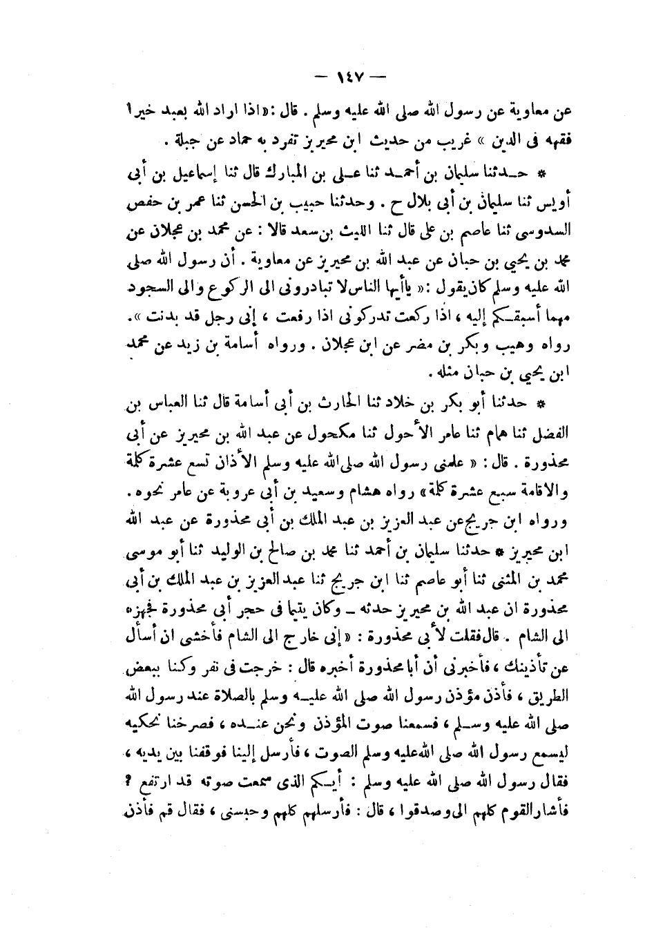حَدَّثَنَا سُلَيْمَانُ بْنُ أَحْمَدَ، ثنا مُحَمَّدُ بْنُ صَالِحِ بْنِ الْوَلِيدِ، ثنا أَبُو مُوسَى مُحَمَّدُ بْنُ الْمُثَنَّى، ثنا أَبُو عَاصِمٍ، ثنا ابْنُ جُرَيْجٍ، ثنا عَبْدُ الْعَزِيزِ بْنُ عَبْدِ الْمَلِكِ بْنِ أَبِي مَحْذُورَةَ، أَنَّ عَبْدَ اللهِ بْنَ مُحَيْرِيزٍ حَدَّثَهُ - وَكَانَ، يَتِيمًا فِي حِجْرِ أَبِي مَحْذُورَةَ فَجَهَّزَهُ إِلَى الشَّامِ - قَالَ: فَقُلْتُ لِأَبِي مَحْذُورَةَ: إِنِّي خَارِجٌ إِلَى الشَّامِ فَأَخْشَى أَنْ أُسْأَلَ عَنْ تَأْذِينِكَ، فَأَخْبَرَنِي أَنَّ أَبَا مَحْذُورَةَ أَخْبَرَهُ قَالَ: خَرَجْتُ فِي نَفَرٍ وَكُنَّا بِبَعْضِ الطَّرِيقِ، فَأَذَّنَ مُؤَذِّنُ النَّبِيِّ صَلَّى اللهُ عَلَيْهِ وَسَلَّمَ بِالصَّلَاةِ عِنْدَ رَسُولِ اللهِ صَلَّى اللهُ عَلَيْهِ وَسَلَّمَ، فَسَمِعْنَا صَوْتَ الْمُؤَذِّنِ وَنَحْنُ عِنْدَهُ، فَصَرَخْنَا نَحْكِيهِ لَيسْمَعَ رَسُولُ اللهِ صَلَّى اللهُ عَلَيْهِ وَسَلَّمَ الصَّوْتَ، فَأَرْسَلَ إِلَيْنَا فَوَقَفْنَا بَيْنَ يَدَيْهِ، فَقَالَ رَسُولُ اللهِ صَلَّى اللهُ عَلَيْهِ وَسَلَّمَ: «§أَيُّكُمُ الَّذِي سَمِعْتُ صَوْتَهُ قَدِ ارْتَفَعَ؟» فَأَشَارَ الْقَوْمُ كُلُّهُمْ إِلَيَّ وَصَدَقُوا، قَالَ: فَأَرْسَلَهُمْ كُلَّهُمْ وَحَبَسَنِي، فَقَالَ: «قُمْ فَأَذِّنْ -[148]- بِالصَّلَاةِ» فَقُمْتُ وَلَا شَيْءَ إِلَيَّ أَكْرَهَ مِنْ رَسُولِ اللهِ صَلَّى اللهُ عَلَيْهِ وَسَلَّمَ وَلَا مِمَّا يَأْمُرُنِي، فَقُمْتُ بَيْنَ يَدَيْ رَسُولِ اللهِ صَلَّى اللهُ عَلَيْهِ وَسَلَّمَ فَأَلْقَى عَلَيَّ رَسُولُ اللهِ صَلَّى اللهُ عَلَيْهِ وَسَلَّمَ التَّأْذِينَ هُوَ بِنَفْسِهِ، الْحَدِيثُ بِطُولِهِ