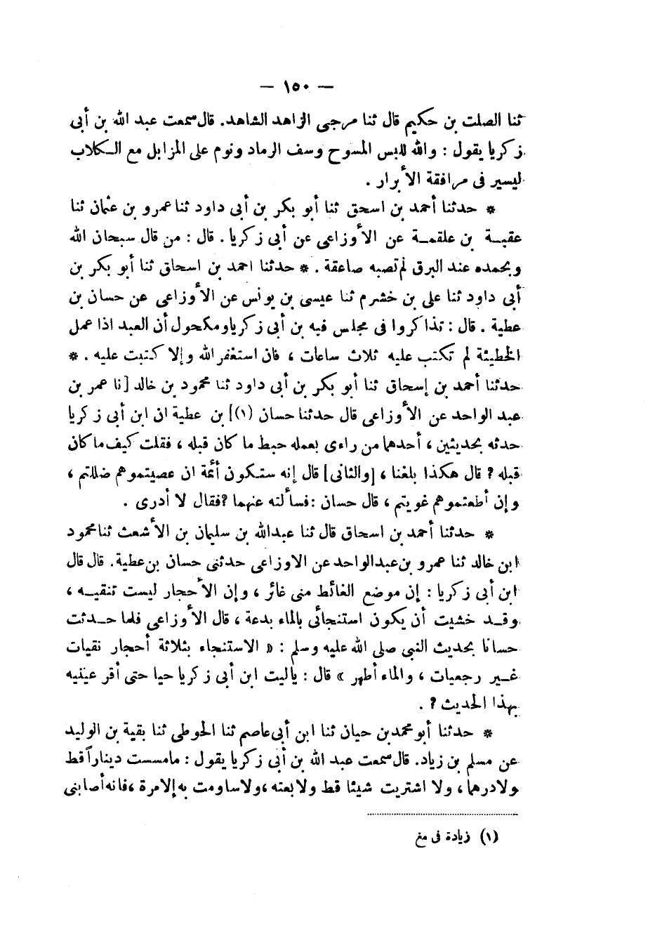حَدَّثَنَا أَحْمَدُ بْنُ إِسْحَاقَ، قَالَ: ثنا عَبْدُ اللهِ بْنُ سُلَيْمَانَ بْنِ الْأَشْعَثِ، ثنا مَحْمُودُ بْنُ خَالِدٍ، ثنا عَمْرُو بْنُ عَبْدِ الْوَاحِدٍ، عَنِ الْأَوْزَاعِيِّ، حَدَّثَنِي حَسَّانُ بْنُ عَطِيَّةَ، قَالَ: قَالَ ابْنُ أَبِي زَكَرِيَّا: إِنَّ مَوْضِعَ الْغَائِطِ مِنِّي غَائِرٌ، وَإِنَّ الْأَحْجَارَ لَيْسَتْ تُنْقِيهِ، وَقَدْ خَشِيتُ أَنْ يَكُونَ اسْتِنْجَائِي بِالْمَاءِ بِدْعَةً، قَالَ الْأَوْزَاعِيُّ: فَلَمَّا حَدَّثْتُ حَسَّانًا بِحَدِيثِ رَسُولِ اللهِ صَلَّى اللهُ عَلَيْهِ وَسَلَّمَ: «§الِاسْتِنْجَاءُ بِثَلَاثَةِ أَحْجَارٍ نَقِيَّاتٍ غَيْرِ رَجْعِيَّاتٍ، وَالْمَاءُ أَطْهُرُ» قَالَ: يَا لَيْتَ ابْنَ أَبِي زَكَرِيَّا حَيًّا حَتَّى أُقِرَّ عَيْنَيْهِ بِهَذَا الْحَدِيثِ
