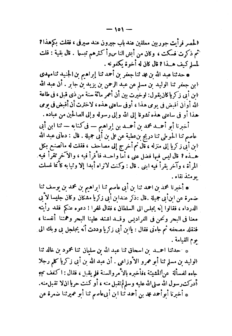 حَدَّثَنَا عَبْدُ اللهِ بْنُ مُحَمَّدٍ، ثنا جَعْفَرُ بْنُ أَحْمَدَ، ثنا إِبْرَاهِيمُ بْنُ الْجُنَيْدِ، ثنا مَهْدِيُّ بْنُ جَعْفَرٍ، ثنا الْوَلِيدُ بْنُ مُسْلِمٍ، عَنْ عَبْدِ الرَّحْمَنِ بْنِ يَزِيدَ بْنِ جَابِرٍ، أَنَّ عَبْدَ اللهِ بْنَ أَبِي زَكَرِيَّا، كَانَ يَقُولُ: «§لَوْ خُيِّرْتُ بَيْنَ أَنْ أُعَمَّرَ مِائَةَ سَنَةٍ مِنْ ذِي قَبْلُ فِي طَاعَةِ اللهِ، أَوْ أَنْ أُقْبَضَ فِي يَوْمِي هَذَا، أَوْ فِي سَاعَتِي هَذِهِ، لَاخْتَرْتُ أَنْ أُقْبَضَ فِي يَوْمِي هَذَا، أَوْ فِي سَاعَتِي هَذِهِ، تَشَوُّقًا إِلَى اللهِ وَرَسُولِهِ، والصَّالِحِينَ مِنْ عِبَادِهِ»