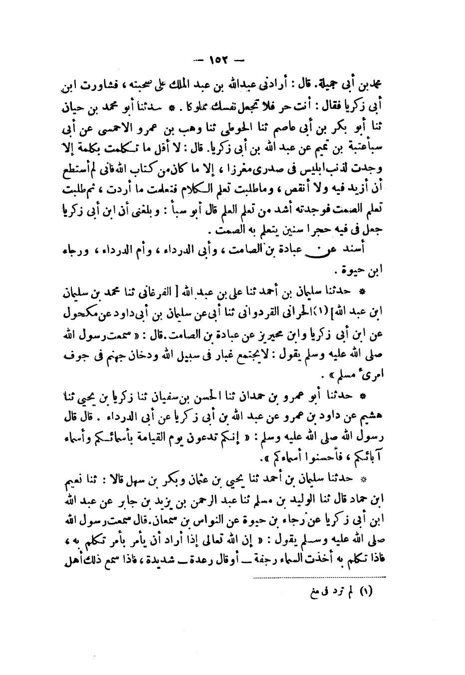 حَدَّثَنَا أَبُو مُحَمَّدِ بْنُ حَيَّانَ، ثنا أَبُو بَكْرِ بْنُ أَبِي عَاصِمٍ، ثنا الْحَوْطِيُّ، ثنا وَهْبُ بْنُ عَمْرٍو الْأَحْمَسِيُّ، عَنْ أَبِي سَبَأٍ عُتْبَةَ بْنِ تَمِيمٍ، عَنْ عَبْدِ اللهِ بْنِ أَبِي زَكَرِيَّا، قَالَ: «§لَا أَقَلَّ مَا تَكَلَّمْتُ بِكَلِمَةٍ إِلَّا وَجَدْتُ لِذَنْبِ إِبْلِيسَ فِي صَدْرِي مَغْرِزًا، إِلَّا مَا كَانَ مِنْ كِتَابِ اللهِ فَإِنِّي لَمْ أَسْتَطِعْ أَنْ أَزِيدَ فِيهِ وَلَا أَنْقُصَ، وَمَا طَلَبْتُ تَعَلُّمَ الْكَلَامِ فَتَعَلَّمْتُ مَا أَرَدْتُ ثُمَّ طَلَبْتُ تَعَلُّمَ الصَّمْتِ فَوَجَدْتُهُ أَشَدَّ مِنْ تَعَلُّمِ الْعِلْمِ»، قَالَ أَبُو سَبَأٍ: وَبَلَغَنِي أَنَّ ابْنَ أَبِي زَكَرِيَّا جَعَلَ فِي فِيهِ حَجَرًا سِنِينَ يَتَعَلَّمُ فِيهِ الصَّمْتَ. أَسْنَدَ عَنْ عُبَادَةَ بْنِ الصَّامِتِ، وَأَبِي الدَّرْدَاءِ، وَأُمِّ الدَّرْدَاءِ، وَرَجَاءِ بْنِ حَيْوَةَ رَضِيَ اللهُ تَعَالَى عَنْهُمْ