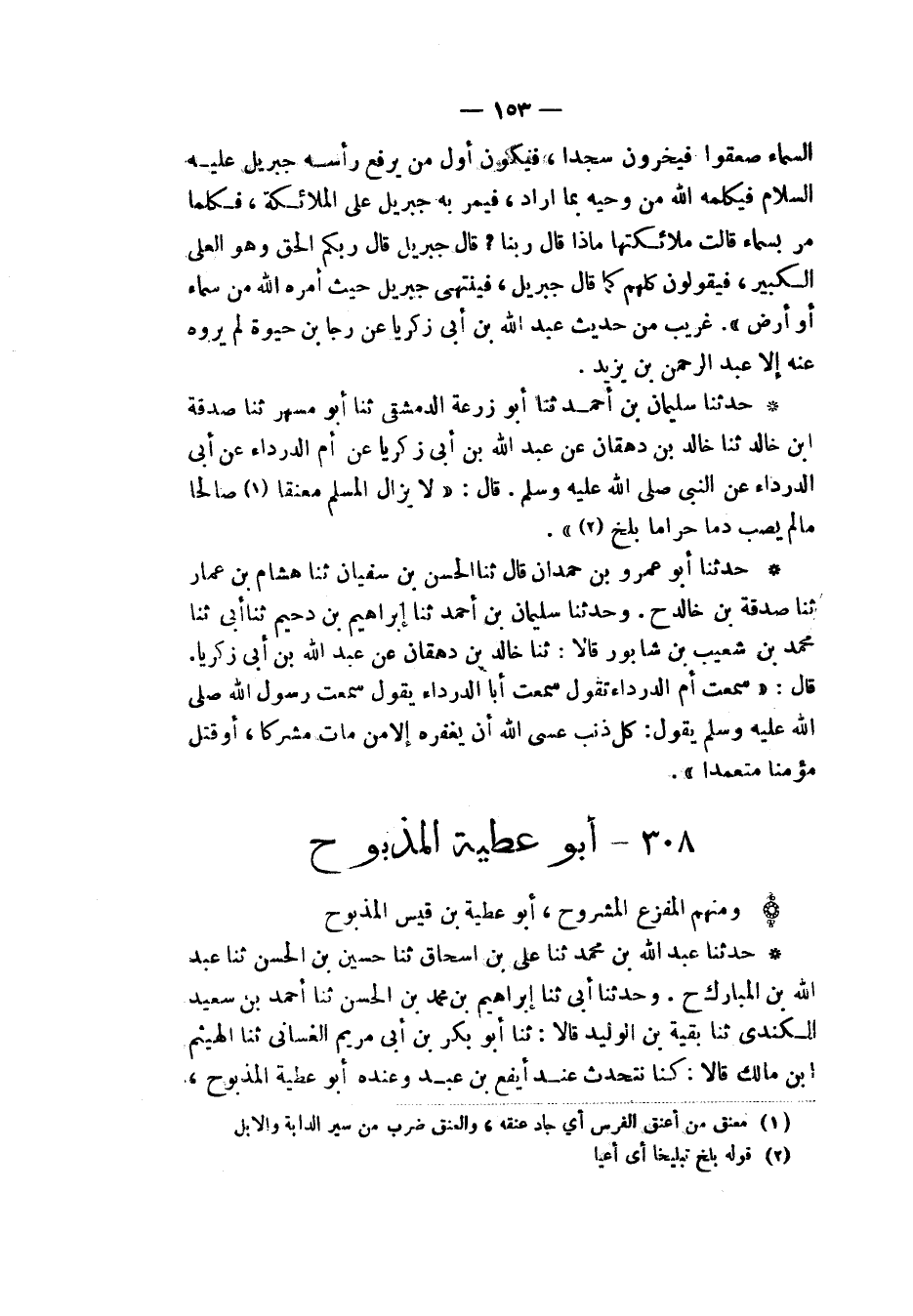 حَدَّثَنَا سُلَيْمَانُ بْنُ أَحْمَدَ، ثنا أَبُو زُرْعَةَ الدِّمَشْقِيُّ، ثنا أَبُو مُسْهِرٍ، ثنا صَدَقَةُ بْنُ خَالِدٍ، ثنا خَالِدُ بْنُ دِهْقَانَ، عَنْ عَبْدِ اللهِ بْنِ أَبِي زَكَرِيَّا، عَنْ أُمِّ الدَّرْدَاءِ، عَنِ النَّبِيِّ صَلَّى اللهُ عَلَيْهِ وَسَلَّمَ قَالَ: «§لَا يَزَالُ الْمُسْلِمُ مُعْنِقًا صَالِحًا مَا لَمْ يُصِبْ دَمًا حَرَامًا بَلَّخَ»