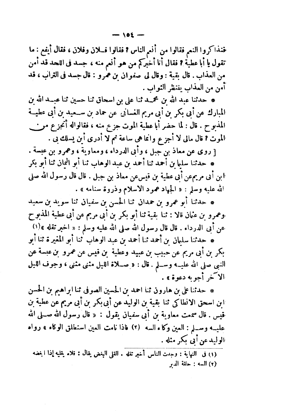 حَدَّثَنَا أَبُو عَمْرِو بْنُ حَمْدَانَ، ثنا الْحَسَنُ بْنُ سُفْيَانَ، نا سُوَيْدُ بْنُ سَعِيدٍ، وَعَمْرُو بْنُ عُثْمَانَ، قَالَا: ثنا بَقِيَّةُ، ثنا أَبُو بَكْرِ بْنُ أَبِي مَرْيمَ، عَنْ أَبِي عَطِيَّةَ الْمَذْبُوحِ، عَنْ أَبِي الدَّرْدَاءِ، قَالَ: قَالَ رَسُولُ اللهِ صَلَّى اللهُ عَلَيْهِ وَسَلَّمَ: «§أَخْبُرْ تَقْلُهْ»