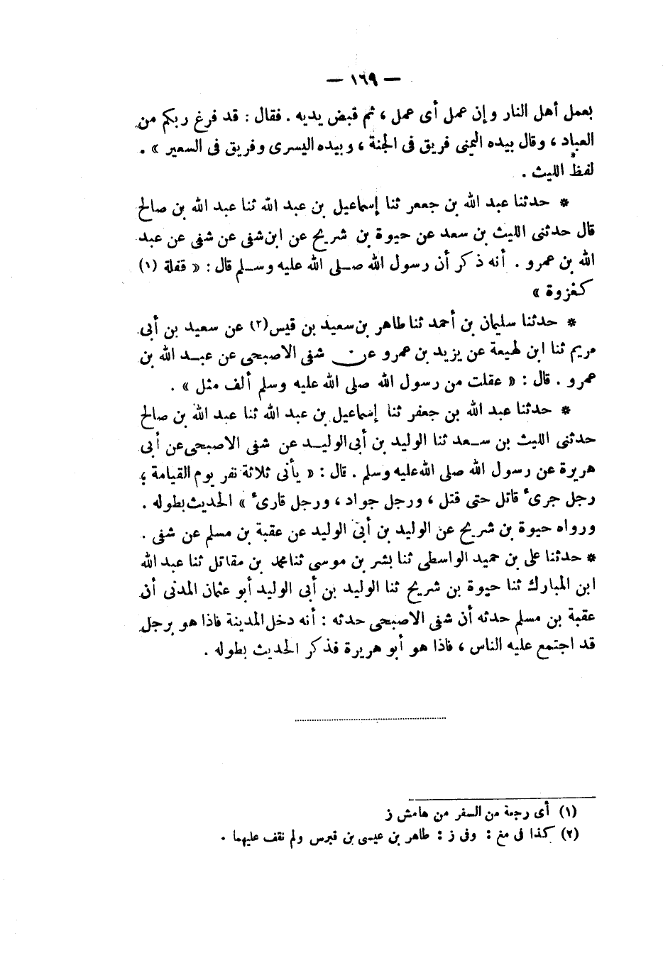 حَدَّثَنَا عَبْدُ اللهِ بْنُ جَعْفَرٍ، ثنا إِسْمَاعِيلُ بْنُ عَبْدِ اللهِ، ثنا عَبْدُ اللهِ بْنُ صَالِحٍ، قَالَ: حَدَّثَنِي اللَّيْثُ بْنُ سَعْدٍ، عَنْ حَيْوَةَ بْنِ شُرَيْحٍ، عَنِ ابْنِ شُفَيٍّ، عَنْ شُفَيٍّ، عَنْ عَبْدِ اللهِ بْنِ عَمْرٍو، أَنَّهُ ذَكَرَ أَنَّ رَسُولَ اللهِ صَلَّى اللهُ عَلَيْهِ وَسَلَّمَ قَالَ: «§قَفْلَةٌ كَغَزْوَةٍ»