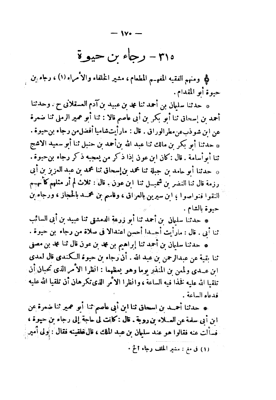 §رَجَاءُ بْنُ حَيْوَةَ وَمِنْهُمُ الْفَقِيهُ الْمُفْهِمُ الْمِطْعَامُ، مُشِيرُ الْخُلَفَاءِ وِالْأُمَرَاءِ، رَجَاءُ بْنُ حَيْوَةَ أَبُو الْمِقْدَامِ