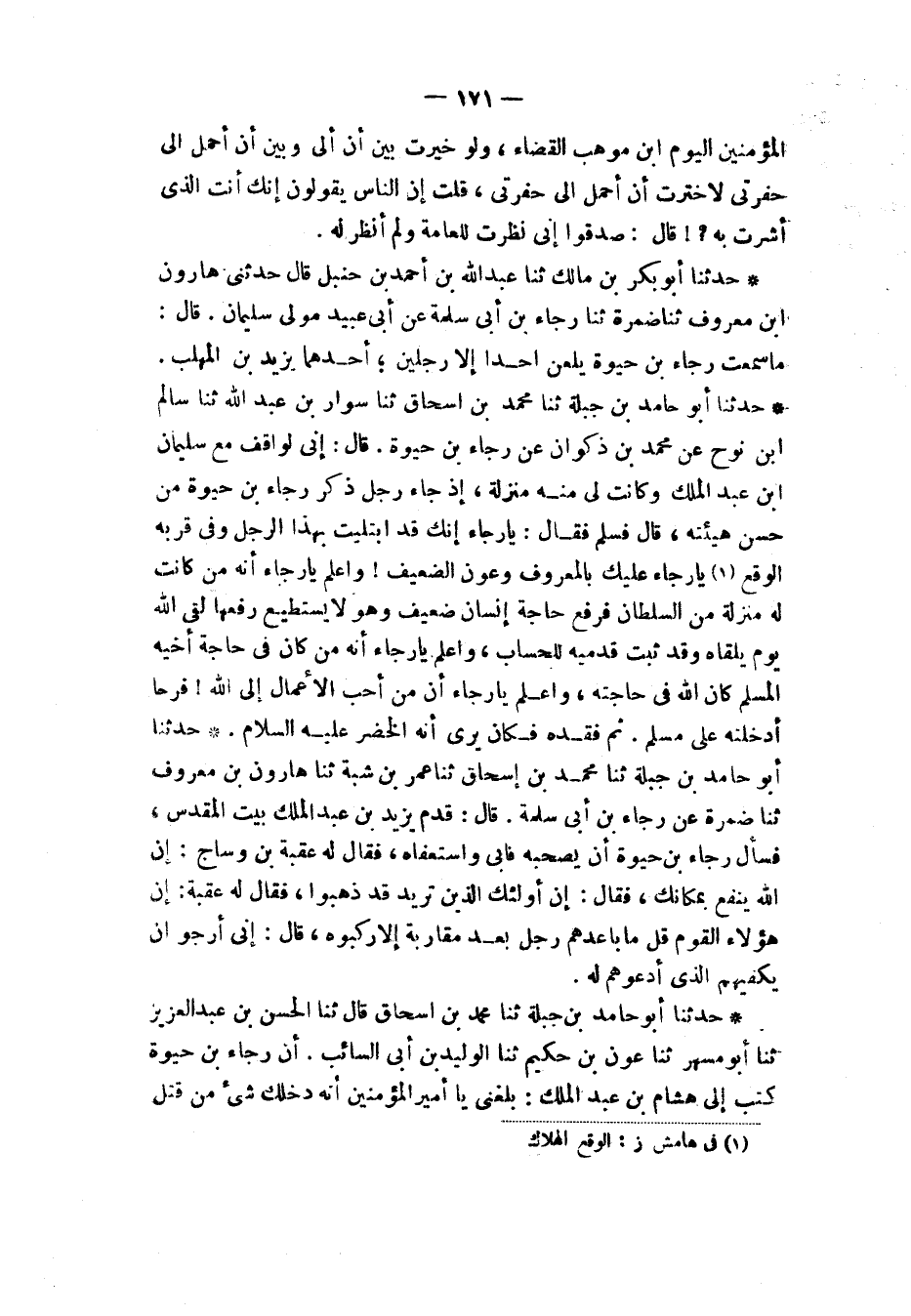 حَدَّثَنَا أَبُو بَكْرِ بْنُ مَالِكٍ، ثنا عَبْدُ اللهِ بْنُ أَحْمَدَ بْنِ حَنْبَلٍ قَالَ: حَدَّثَنِي هَارُونُ بْنُ مَعْرُوفٍ، ثنا ضَمْرَةُ، ثنا رَجَاءُ بْنُ أَبِي سَلَمَةَ، عَنْ أَبِي عُبَيْدٍ، مَوْلَى سُلَيْمَانَ قَالَ: «§مَا سَمِعْتُ رَجَاءَ بْنَ حَيْوَةَ، يلْعَنُ أَحَدًا إِلَّا رَجُلَيْنِ أَحَدُهُمَا يَزِيدُ بْنُ الْمُهَلَّبِ»