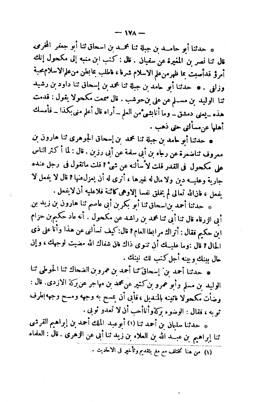 حَدَّثَنَا أَبُو حَامِدِ بْنُ جَبَلَةَ، ثنا مُحَمَّدُ بْنُ إِسْحَاقَ، ثنا دَاوُدُ بْنُ رُشَيْدٍ، ثنا الْوَلِيدُ بْنُ مُسْلِمٍ، عَنْ عَلِيِّ بْنِ حَوْشَبٍ قَالَ: سَمِعْتُ مَكْحُولًا، يَقُولُ: " §قَدِمْتُ هَذِهِ - يَعْنِي دِمَشْقَ - وَمَا أَنَا بِشَيْءٍ مِنَ الْعِلْمِ - أُرَاهُ قَالَ: أَعْلَمُ مِنِّي بِكَذَا - فَأَمْسَكَ أَهْلُهَا عَنْ مَسْأَلَتِي حَتَّى ذَهَبَ "