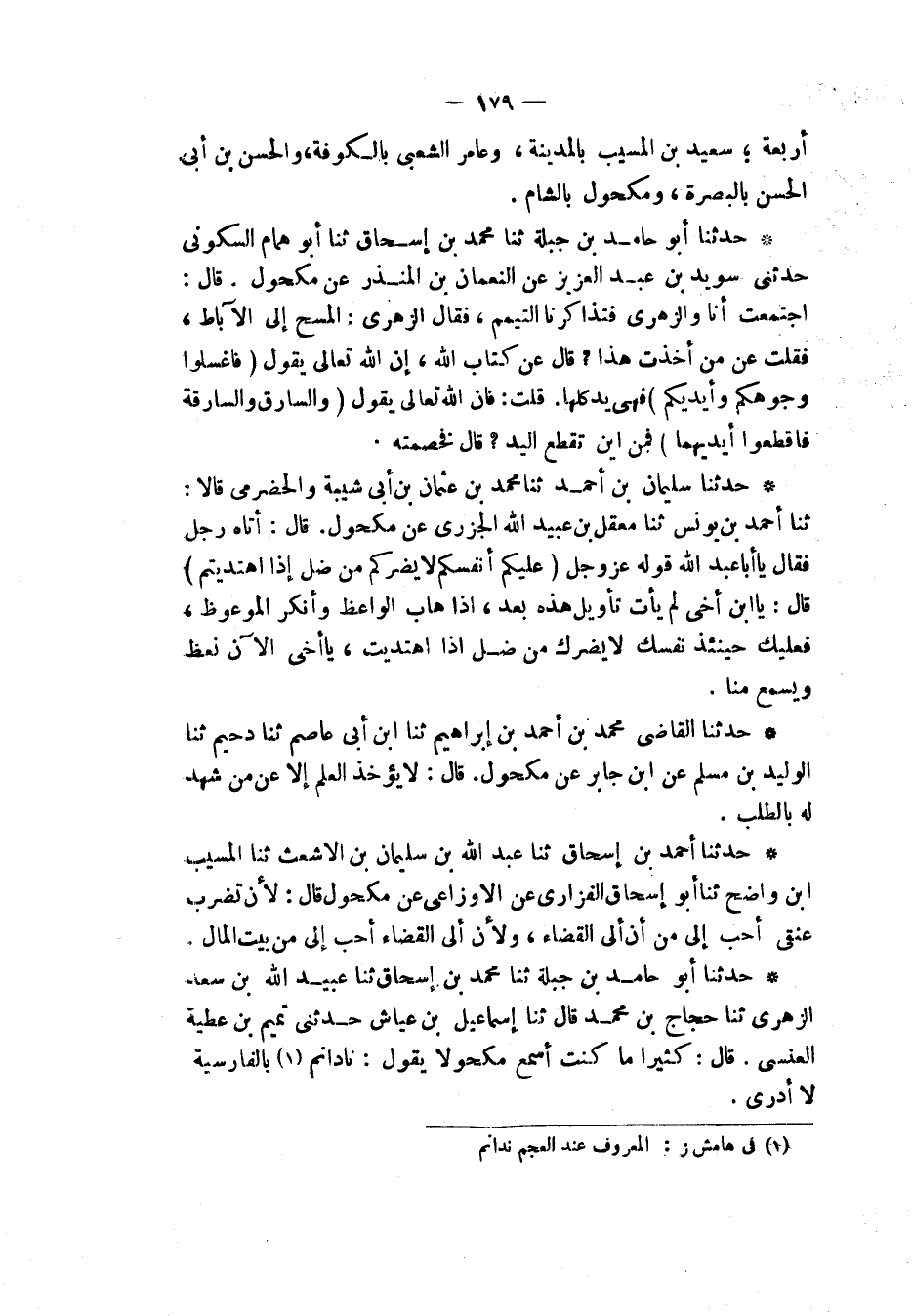 حَدَّثَنَا أَبُو حَامِدِ بْنُ جَبَلَةَ، ثنا مُحَمَّدُ بْنُ إِسْحَاقَ، ثنا عُبَيْدُ اللهِ بْنُ سَعْدٍ الزُّهْرِيُّ، ثنا حَجَّاجُ بْنُ مُحَمَّدٍ قَالَ: ثنا إِسْمَاعِيلُ بْنُ عَيَّاشٍ، حَدَّثَنِي تَمِيمُ بْنُ عَطِيَّةَ الْعَنْسِيُّ قَالَ: كَثِيرًا مَا كُنْتُ أَسْمَعُ مَكْحُولًا يَقُولُ: " §نَادَانَمْ بِالْفَارِسِيَّةِ: لَا أَدْرِي "
