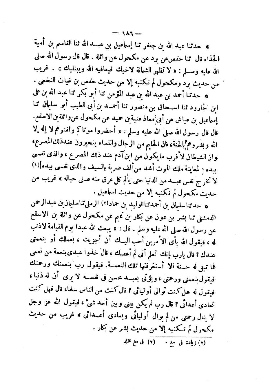 حَدَّثَنَا سُلَيْمَانُ بْنُ أَحْمَدَ، ثنا الْوَلِيدُ بْنُ حَمَّادٍ الرَّمْلِيُّ، ثنا سُلَيْمَانُ بْنُ عَبْدِ الرَّحْمَنِ الدِّمَشْقِيُّ، ثنا بِشْرُ بْنُ عَوْنٍ، عَنْ بَكَّارِ بْنِ تَمِيمٍ، عَنْ مَكْحُولٍ، عَنْ وَاثِلَةَ بْنِ الْأَسْقَعِ، عَنْ رَسُولِ اللهِ صَلَّى اللهُ عَلَيْهِ وَسَلَّمَ قَالَ: " §يَبْعَثُ اللهُ عَبْدًا يَوْمَ الْقِيَامَةِ لَا ذَنْبَ لَهُ، فَيَقُولُ اللهُ: بِأَيِّ الْأَمْرَيْنِ أَحَبُّ إِلَيْكَ أَنْ أَجْزِيَكَ: بِعَمَلِكَ أَوْ بِنِعْمَتِي عِنْدَكَ، قَالَ: يَا رَبِّ، إِنَّكَ تَعْلَمُ أَنِّي لَمْ أَعْصِكَ، قَالَ: خُذُوا عَبْدِي بِنِعْمَةٍ مِنْ نِعَمِي، فَمَا تَبْقَى لَهُ حَسَنَةٌ إِلَّا اسْتَغْرَقَتْهَا تِلْكَ النِّعْمَةُ، فَيَقُولُ: رَبِّ، بِنِعْمَتِكَ وَرَحْمَتِكَ، فَيَقُولُ: بِنِعْمَتِي وَرَحْمَتِي، وَيُؤْتَى بِعَبْدٍ مُحْسِنٍ فِي نَفْسِهِ، لَا يَرَى أَنَّ لَهُ ذَنْبًا، فَيَقُولُ لَهُ: هَلْ كُنْتَ تُوَالِي أَوْلِيَائِي؟ قَالَ: كُنْتُ مِنَ النَّاسِ سِلْمًا، قَالَ: فَهَلْ كُنْتَ تُعَادِي أَعْدَائِي؟ قَالَ: رَبِّ لَمْ يَكُنْ بَيْنِي وَبَيْنَ أَحَدٍ شَيْءٌ، فَيَقُولُ اللهُ عَزَّ وَجَلَّ: لَا يَنَالُ رَحْمَتِي مَنْ لَمْ يُوَالِ أَوْلِيَائِي، وَيُعَادِي أَعْدَائِي " غَرِيبٌ مِنْ حَدِيثِ مَكْحُولٍ، لَمْ نَكْتُبْهُ إِلَّا مِنْ حَدِيثِ بِشْرٍ عَنْ بَكَّارٍ