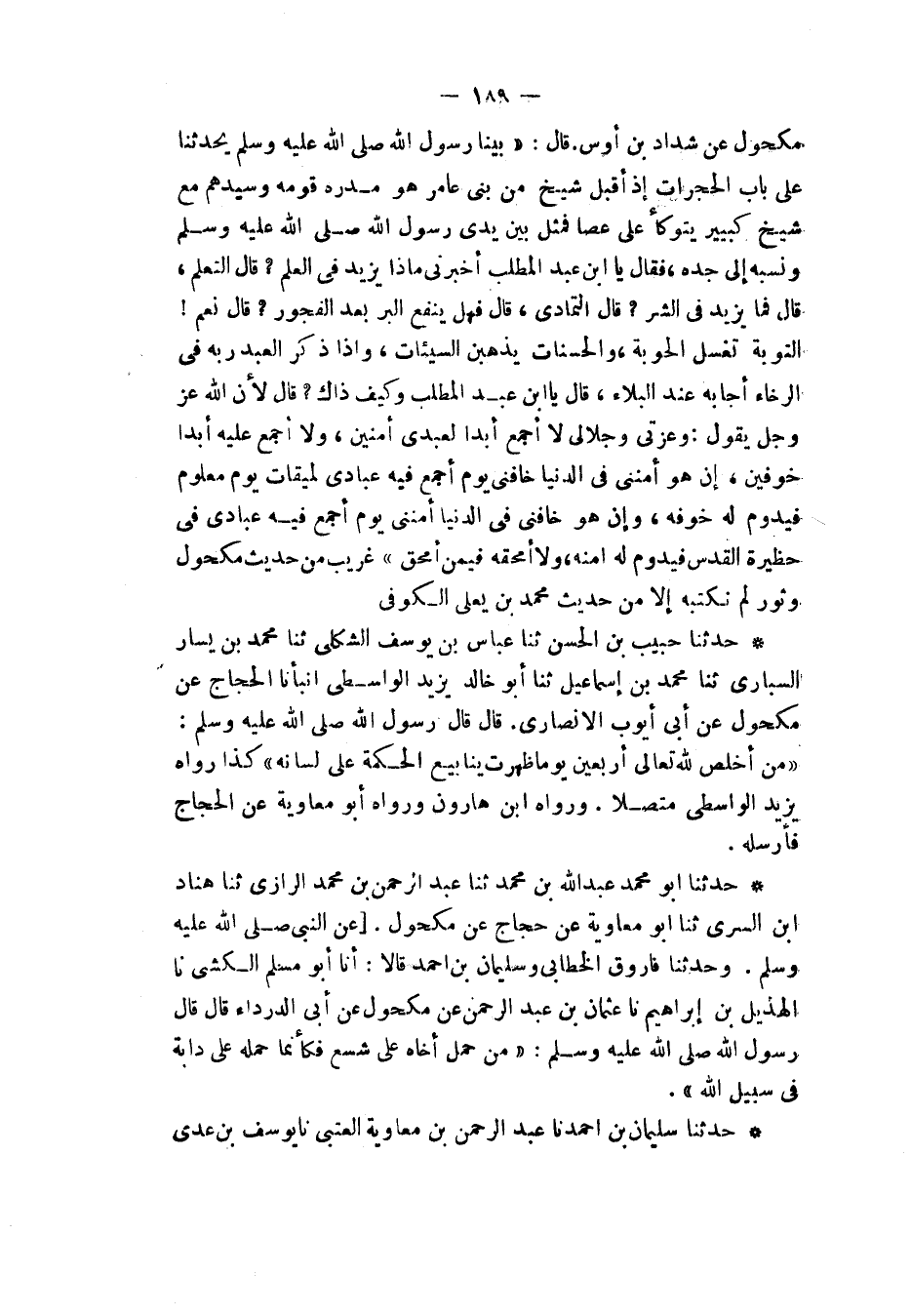 حَدَّثَنَا أَبُو مُحَمَّدٍ عَبْدُ اللهِ بْنِ مُحَمَّدٍ، ثنا عَبْدُ الرَّحْمَنِ بْنُ مُحَمَّدٍ الرَّازِيُّ، ثنا هَنَّادُ بْنُ السَّرِيِّ، ثنا أَبُو مُعَاوِيَةَ، عَنْ حَجَّاجٍ، عَنْ مَكْحُولٍ، عَنِ النَّبِيِّ صَلَّى اللهُ عَلَيْهِ وَسَلَّمَ وَحَدَّثَنَا فَارُوقٌ الْخَطَّابِيُّ، وَسُلَيْمَانُ بْنُ أَحْمَدَ قَالَا: أنا أَبُو مُسْلِمٍ الْكَشِّيُّ، ثنا الْهُذَيْلُ بْنُ إِبْرَاهِيمَ، ثنا عُثْمَانُ بْنُ عَبْدِ الرَّحْمَنِ، عَنْ مَكْحُولٍ، عَنْ أَبِي الدَّرْدَاءِ قَالَ: قَالَ رَسُولُ اللهِ صَلَّى اللهُ عَلَيْهِ وَسَلَّمَ: «§مَنْ حَمَلَ أَخَاهُ عَلَى شِسْعٍ فَكَأَنَّمَا حَمَلَهُ عَلَى دَابَّةٍ فِي سَبِيلِ اللهِ»