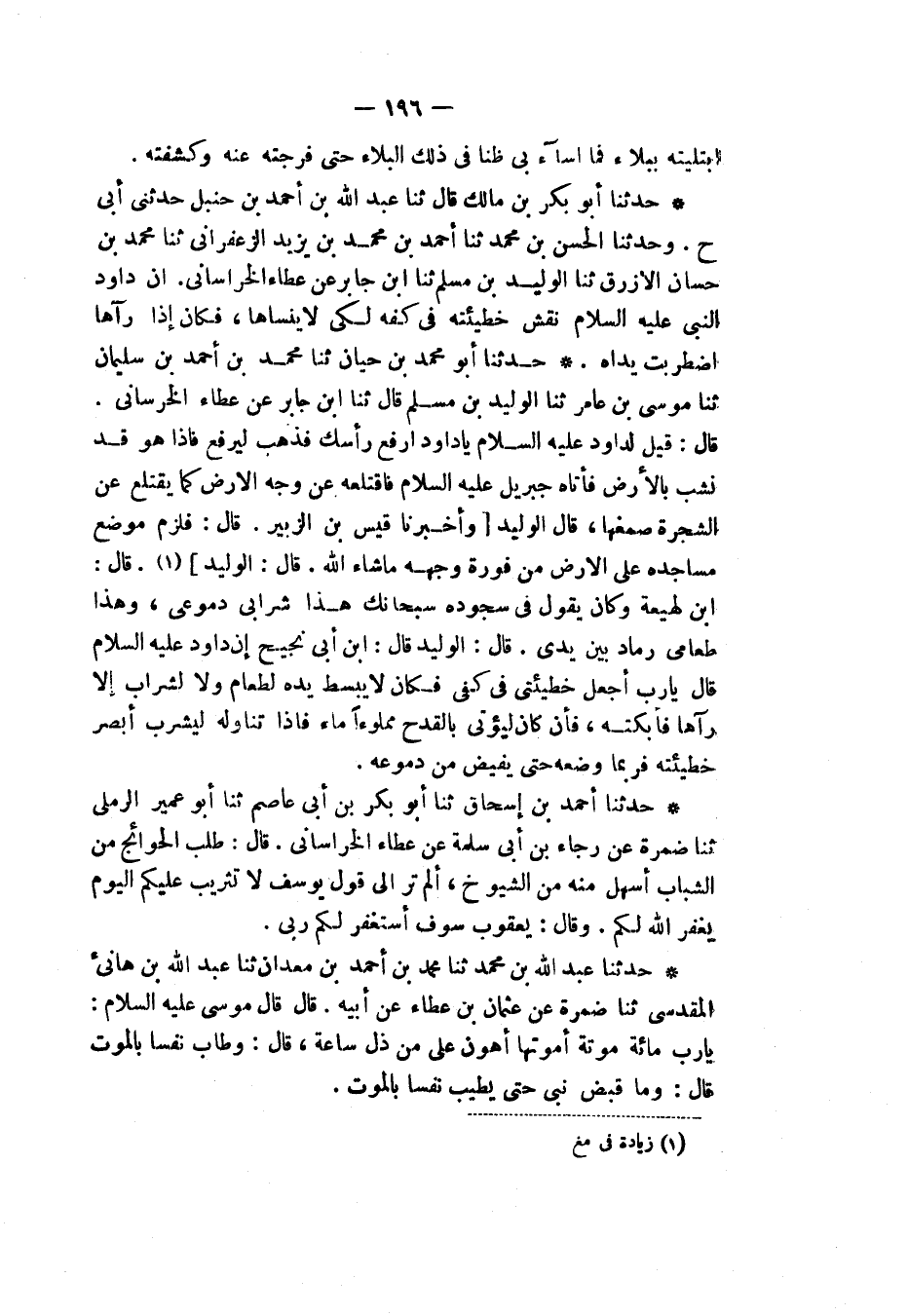 حَدَّثَنَا أَبُو بَكْرِ بْنُ مَالِكٍ قَالَ: ثنا عَبْدُ اللهِ بْنُ أَحْمَدَ بْنِ حَنْبَلٍ، حَدَّثَنِي أَبِي ح. وَحَدَّثَنَا الْحَسَنُ بْنُ مُحَمَّدٍ، ثنا أَحْمَدُ بْنُ مُحَمَّدِ بْنِ يَزِيدَ الزَّعْفَرَانِيُّ، ثنا مُحَمَّدُ بْنُ حَسَّانَ الْأَزْرَقُ، ثنا الْوَلِيدُ بْنُ مُسْلِمٍ، ثنا ابْنُ جَابِرٍ، عَنْ عَطَاءٍ الْخُرَاسَانِيِّ «أَنَّ دَاوُدَ النَّبِيَّ، عَلَيْهِ السَّلَامُ §نَقَشَ خَطِيئَتَهُ فِي كَفِّهِ لِكَيْ لَا يَنْسَاهَا، فَكَانَ إِذَا رَآهَا اضْطَرَبَتْ يَدَاهُ»