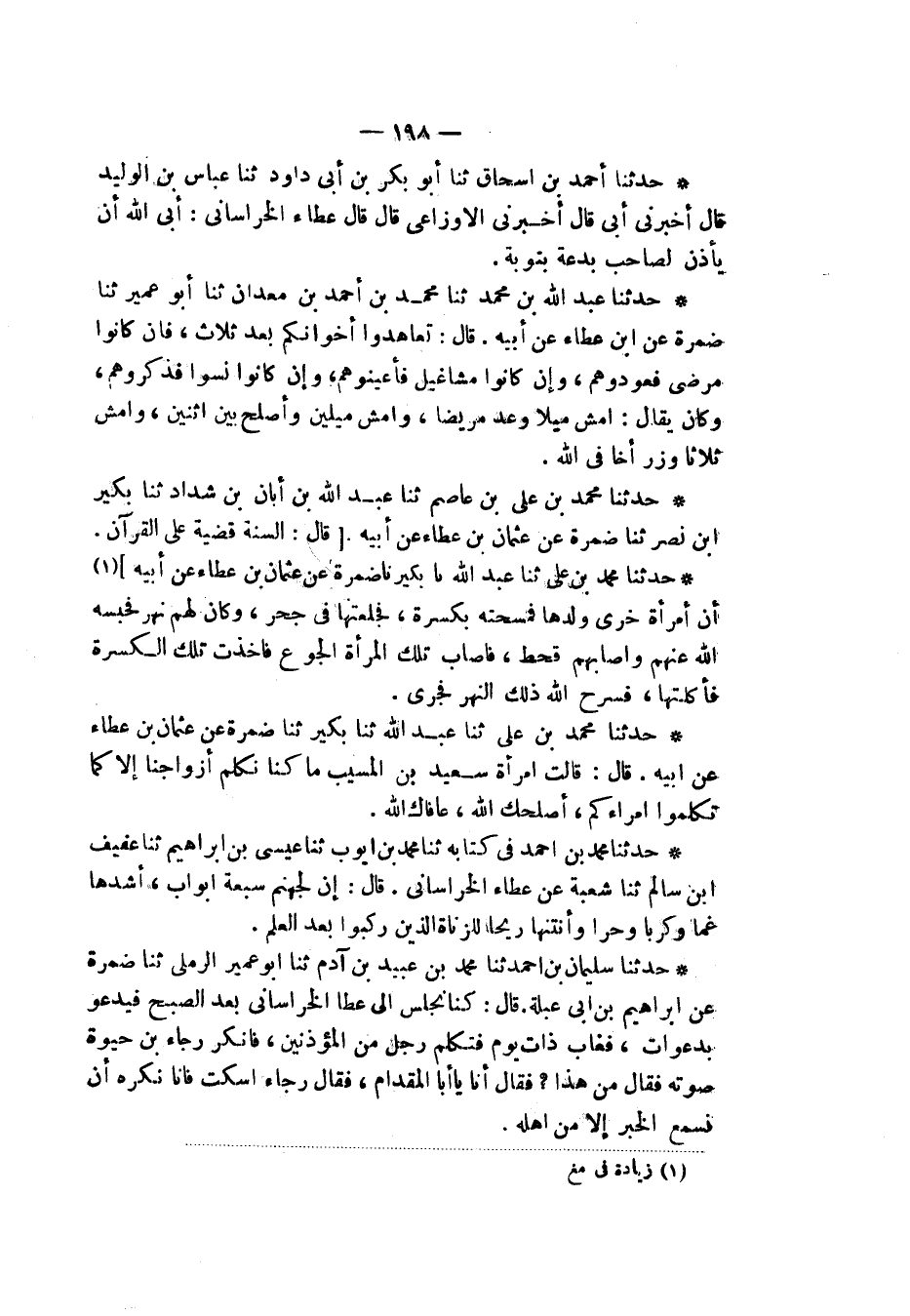 حَدَّثَنَا أَحْمَدُ بْنُ إِسْحَاقَ، ثنا أَبُو بَكْرِ بْنُ أَبِي دَاوُدَ، ثنا عَبَّاسُ بْنُ الْوَلِيدِ قَالَ: أَخْبَرَنِي أَبِي قَالَ: أَخْبَرَنِي الْأَوْزَاعِيُّ قَالَ: قَالَ عَطَاءٌ الْخُرَاسَانِيُّ: «§أَبَى اللهُ أَنْ يَأْذَنَ لِصَاحِبِ بِدْعَةٍ بِتَوْبَةٍ»