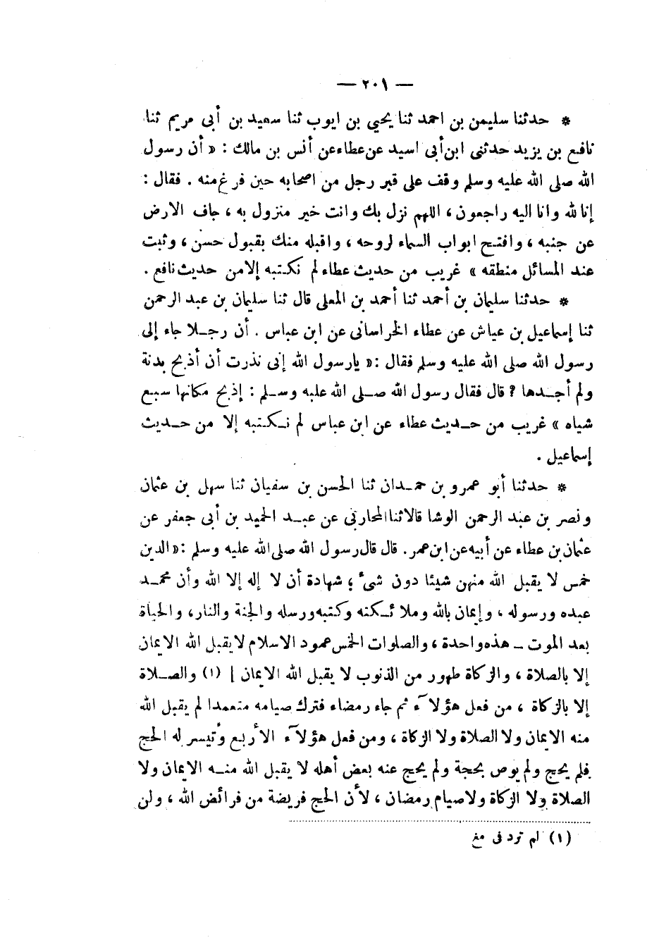 حَدَّثَنَا أَبُو عَمْرِو بْنُ حَمْدَانَ، ثنا الْحَسَنُ بْنُ سُفْيَانَ، ثنا سَهْلُ بْنُ عُثْمَانَ، وَنَصْرُ بْنُ عَبْدِ الرَّحْمَنِ الْوَشَّاءُ قَالَا: ثنا الْمُحَارِبِيُّ، عَنْ عَبْدِ الْحَمِيدِ بْنِ أَبِي جَعْفَرٍ، عَنْ عُثْمَانَ بْنِ عَطَاءٍ، عَنْ أَبِيهِ، عَنِ ابْنِ عُمَرَ قَالَ: قَالَ رَسُولُ اللهِ صَلَّى اللهُ عَلَيْهِ وَسَلَّمَ: " §الدِّينُ خَمْسٌ لَا يَقْبَلُ اللهُ مِنْهُنَّ شَيْئًا دُونَ شَيْءٍ: شَهَادَةُ أَنْ لَا إِلَهَ إِلَّا اللهُ، وَأَنَّ مُحَمَّدًا عَبْدُهُ وَرَسُولُهُ، وَإِيمَانٌ بِاللهِ، وَمَلَائِكَتِهِ، وَكُتُبِهِ، وَرُسُلِهِ، وَالْجَنَّةِ وَالنَّارِ، وَالْحَيَاةِ بَعْدَ الْمَوْتِ، هَذِهِ وَاحِدَةٌ، وَالصَّلَوَاتُ الْخُمْسُ عَمُودُ الْإِسْلَامِ، لَا يُقْبَلُ اللهُ الْإِيمَانُ إِلَّا بِالصَّلَاةِ، وَالزَّكَاةِ طَهُورٌ مِنَ الذُّنُوبِ، لَا يَقْبَلُ اللهُ الْإِيمَانَ وَالصَّلَاةَ إِلَّا بِالزَّكَاةِ، مَنْ فَعَلَ هَؤُلَاءِ ثُمَّ جَاءَ رَمَضَانَ فَتَرَكَ صِيَامَهُ مُتَعَمِّدًا لَمْ يَقْبَلِ اللهُ مِنْهُ الْإِيمَانَ، وَلَا الصَّلَاةَ، وَلَا الزَّكَاةَ، وَمَنْ فَعَلَ هَؤُلَاءِ الْأَرْبَعَ وَتَيسَّرَ لَهُ الْحَجُّ فَلَمْ يَحُجَّ وَلَمْ يُوصِ بِحَجَّةٍ، وَلَمْ يَحُجَّ عَنْهُ بَعْضُ أَهْلِهِ لَا يَقْبَلُ اللهُ مِنْهُ الْإِيمَانَ، وَلَا الصَّلَاةَ، وَلَا الزَّكَاةَ، وَلَا صِيَامَ رَمَضَانَ، لِأَنَّ الْحَجَّ فَرِيضَةٌ مِنْ فَرَائِضِ اللهِ، وَلَنْ -[202]- يَقْبَلَ اللهُ تَعَالَى شَيْئًا مِنْ فَرَائِضِهِ، بَعْضَهَا دُونَ بَعْضٍ " غَرِيبٌ مِنْ حَدِيثِ ابْنِ عُمَرَ بِهَذَا اللَّفْظِ، لَمْ يَرْوِهِ عَنْهُ إِلَّا عَطَاءٌ، وَلَا عَنْهُ إِلَّا ابْنُهُ عُثْمَانُ، تَفَرَّدَ بِهِ عَبْدُ الْحَمِيدِ بْنُ أَبِي جَعْفَرٍ
