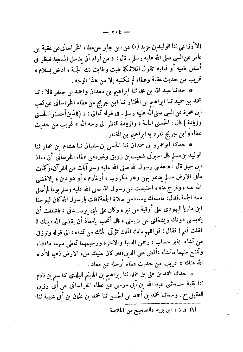 حَدَّثَنَا عَبْدُ اللهِ بْنُ مُحَمَّدٍ، ثنا إِبْرَاهِيمُ بْنُ مَعْدَانَ، وَأَحْمَدُ بْنُ جَعْفَرٍ قَالَا: ثنا مُحَمَّدُ بْنُ حُمَيْدٍ، ثنا إِبْرَاهِيمُ بْنُ الْمُخْتَارِ، ثنا ابْنُ جُرَيْجٍ، عَنْ عَطَاءٍ الْخُرَاسَانِيِّ، عَنْ كَعْبِ بْنِ عُجْرَةَ، عَنِ النَّبِيِّ صَلَّى اللهُ عَلَيْهِ وَسَلَّمَ فِي قَوْلِهِ تَعَالَى: {§لِلَّذِينَ أَحْسَنُوا الْحُسْنَى وَزِيَادَةٌ} [يونس: 26]. قَالَ: «الْحُسْنَى الْجَنَّةُ وَالزِّيَادَةُ النَّظَرُإِلَى وَجْهِ اللهِ» غَرِيبٌ مِنْ حَدِيثِ عَطَاءٍ وَابْنِ جُرَيْجٍ، تَفَرَّدَ بِهِ إِبْرَاهِيمُ بْنُ الْمُخْتَارِ
