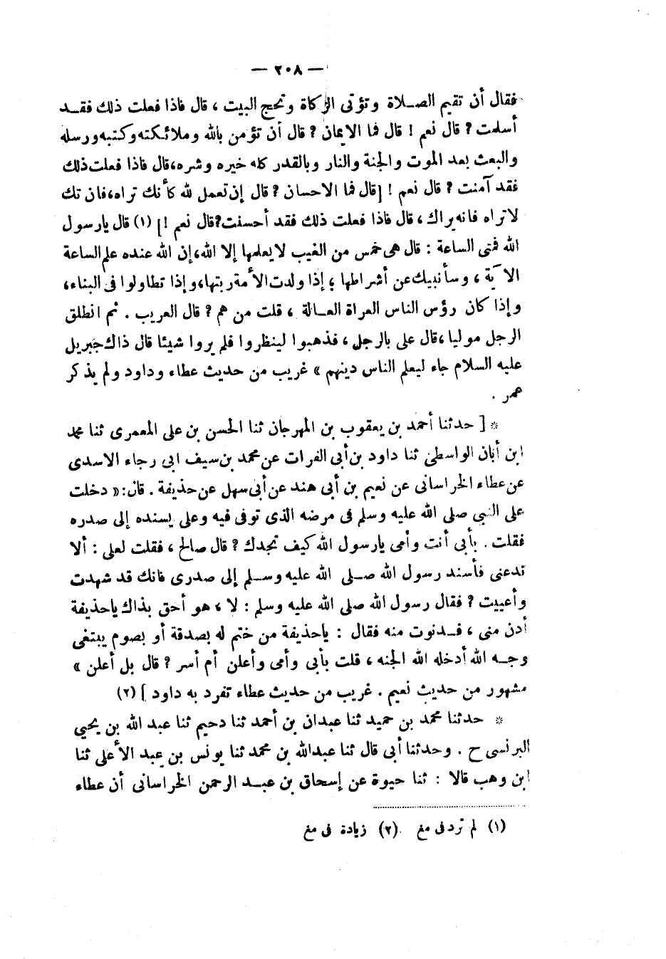 حَدَّثَنَا مُحَمَّدُ بْنُ حُمَيْدٍ، ثنا عَبْدَانُ بْنُ أَحْمَدَ، ثنا دُحَيْمٌ، ثنا عَبْدُ اللهِ بْنُ يَحْيَى الْبَرْنَسِيُّ، ح. وَحَدَّثَنَا أَبِي قَالَ: ثنا عَبْدُ اللهِ بْنُ مُحَمَّدٍ، ثنا يُونُسُ بْنُ عَبْدِ الْأَعْلَى، ثنا ابْنُ وَهْبٍ قَالَا: ثنا حَيْوَةُ، عَنْ إِسْحَاقَ بْنِ عَبْدِ الرَّحْمَنِ الْخُرَاسَانِيُّ، أَنَّ عَطَاءً -[209]- الْخُرَاسَانِيَّ حَدَّثَهُ، عَنْ نَافِعٍ، عَنِ ابْنِ عُمَرَ قَالَ: سَمِعْتُ رَسُولَ اللهِ صَلَّى اللهُ عَلَيْهِ وَسَلَّمَ يَقُولُ: «§إِذَا تَبَايعْتُمْ بِالْعِينَةِ، وَأَخَذْتُمْ أَذْنَابَ الْبَقَرِ، وَرَضِيتُمْ بِالزَّرْعِ، وَتَرَكْتُمُ الْجِهَادَ، سَلَّطَ اللهُ عَلَيْكُمْ ذُلًّا لَا يَنْزِعُهُ عَنْكُمْ حَتَّى تَرْجِعُوا إِلَى دِينِكُمْ» غَرِيبٌ مِنْ حَدِيثِ عَطَاءٍ، عَنْ نَافِعٍ، تَفَرَّدَ بِهِ حَيْوَةُ، عَنْ إِسْحَاقَ