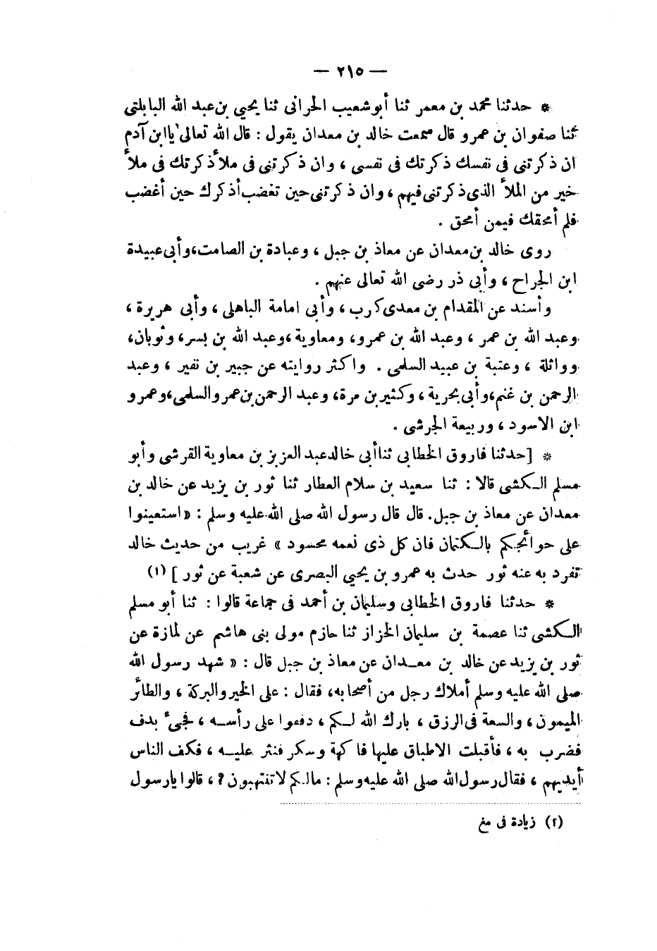 حَدَّثَنَا مُحَمَّدُ بْنُ مَعْمَرٍ، ثنا أَبُو شُعَيْبٍ الْحَرَّانِيُّ، ثنا يَحْيَى بْنُ عَبْدِ اللهِ الْبَابْلُتِّيُّ، ثنا صَفْوَانُ بْنُ عَمْرٍو قَالَ: سَمِعْتُ خَالِدَ بْنَ مَعْدَانَ يَقُولُ: " قَالَ اللهُ تَعَالَى: يَا ابْنَ آدَمَ، §إِنْ ذَكَرْتَنِي فِي نَفْسِكَ ذَكَرْتُكَ فِي نَفْسِي، وَإِنْ ذَكَرْتَنِي فِي مَلَأٍ ذَكَرْتُكَ فِي مَلَأٍ خَيْرٍ مِنَ الْمَلَأِ الَّذِي ذَكَرْتَنِي فِيهِمْ، وَإِنْ ذَكَرْتَنِي حِينَ تَغْضَبُ أَذْكُرْكَ حِينَ أَغْضَبُ فَلَمْ أَمْحَقْكَ فِيمَنْ أَمْحَقُ " رَوَى خَالِدُ بْنُ مَعْدَانَ، عَنْ مُعَاذِ بْنِ جَبَلٍ، وَعُبَادَةَ بْنِ الصَّامِتِ، وَأَبِي عُبَيْدَةَ بْنِ الْجَرَّاحِ، وَأَبِي ذَرٍّ رَضِيَ اللهُ تَعَالَى عَنْهُمْ وَأَسْنَدَ عَنِ الْمِقْدَامِ بْنِ مَعْدِيِّ كَرِبَ، وَأَبِي أُمَامَةَ الْبَاهِلِيِّ، وَأَبِي هُرَيْرَةَ، وَعَبْدِ اللهِ بْنِ عُمَرَ، وَعَبْدِ اللهِ بْنِ عَمْرٍو، وَمُعَاوِيَةَ، وَعَبْدِ اللهِ بْنِ بُسْرٍ، وَثَوْبَانَ، وَوَاثِلَةَ، وَعُتْبَةَ بْنِ عُبَيْدٍ السُّلَمِيِّ، وَأَكْثَرُ رِوَايتِهِ عَنْ جُبَيْرِ بْنِ نُفَيْرٍ، وَعَبْدِ الرَّحْمَنِ بْنِ غَنْمٍ، وَأَبِي بَحْرِيَّةَ، وَكَثِيرِ بْنِ مُرَّةَ، وَعَبْدِ الرَّحْمَنِ بْنِ عَمْرٍو السُّلَمِيِّ، وَعَمْرِو بْنِ الْأَسْوَدِ، وَرَبِيعَةَ الْجُرَشِيِّ