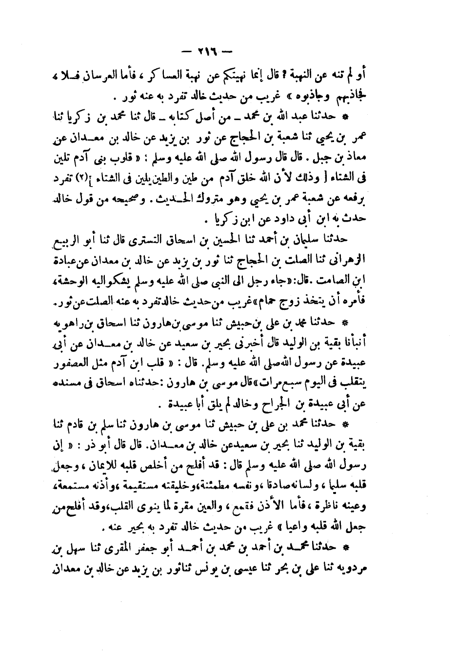 حَدَّثَنَا مُحَمَّدُ بْنُ عَلِيِّ بْنِ حُبَيْشٍ، ثنا مُوسَى بْنُ هَارُونَ، ثنا سَلْمُ بْنُ قَادِمٍ، ثنا بَقِيَّةُ بْنُ الْوَلِيدِ، ثنا بَحِيرُ بْنُ سَعْدٍ، عَنْ خَالِدِ بْنِ مَعْدَانَ قَالَ: قَالَ أَبُو ذَرٍّ: إِنَّ رَسُولَ اللهِ صَلَّى اللهُ عَلَيْهِ وَسَلَّمَ قَالَ: «§قَدْ أَفْلَحَ مَنْ أَخْلَصَ قَلْبَهُ لِلْإِيمَانِ، وَجَعَلَ قَلْبَهُ سَلِيمًا، وَلِسَانَهُ صَادِقًا، وَنَفْسَهُ مُطْمَئِنَّةٌ، وَخَلِيقَتَهُ مُسْتَقِيمَةً، وَأُذُنَهُ مُسْتَمِعَةً، وَعَيْنَهُ نَاظِرَةً، فَأَمَّا الْأُذُنُ فَقَمْعٌ، وَالْعَيْنُ مُقِرَّةٌ لِمَا ينْوِي الْقَلْبُ، وَقَدْ أَفْلَحَ مَنْ جَعَلَ اللهُ قَلْبَهُ وَاعِيًا» غَرِيبٌ مِنْ حَدِيثِ خَالِدٍ تَفَرَّدَ بِهِ بَحِيرٌ عَنْهُ