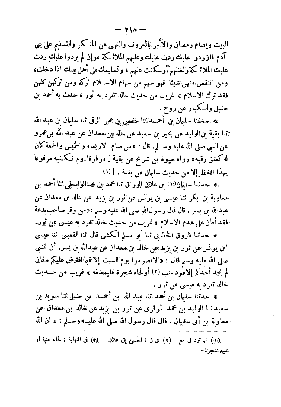 حَدَّثَنَا سُلَيْمَانُ بْنُ عَلَّانَ الْوَرَّاقُ، ثنا مُحَمَّدُ بْنُ مُحَمَّدٍ الْوَاسِطِيُّ، ثنا أَحْمَدُ بْنُ مُعَاوِيَةَ بْنِ بَكْرٍ، ثنا عِيسَى بْنُ يُونُسَ، عَنْ ثَوْرِ بْنِ يَزِيدَ، عَنْ خَالِدِ بْنِ مَعْدَانَ، عَنْ عَبْدِ اللهِ بْنِ بُسْرٍ قَالَ: قَالَ رَسُولُ اللهِ صَلَّى اللهُ عَلَيْهِ وَسَلَّمَ: «§مَنْ وَقَّرَ صَاحِبَ بِدْعَةٍ فَقَدَ أَعَانَ عَلَى هَدْمِ الْإِسْلَامِ» غَرِيبٌ مِنْ حَدِيثِ خَالِدٍ، تَفَرَّدَ بِهِ عِيسَى عَنْ ثَوْرٍ