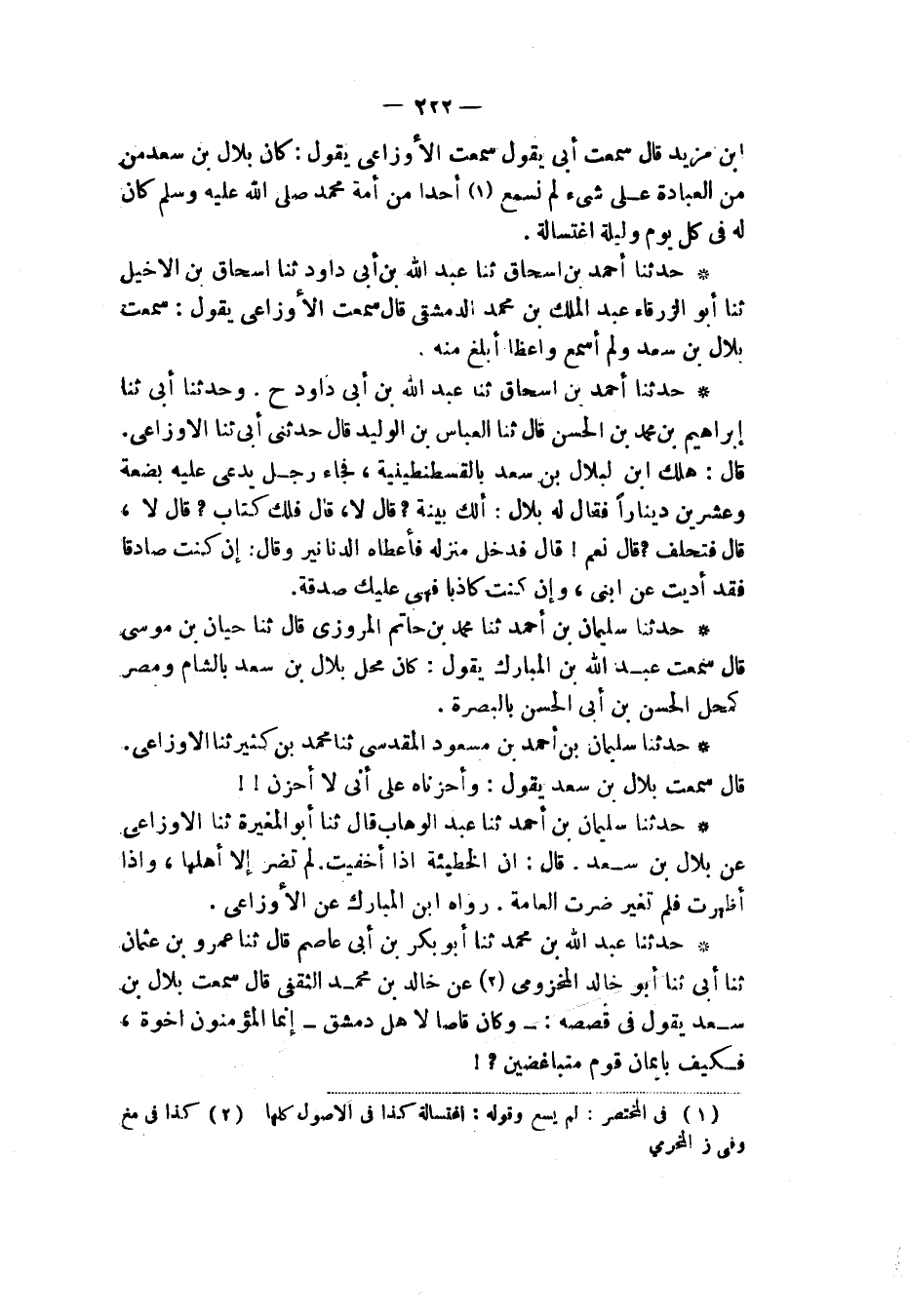 حَدَّثَنَا أَحْمَدُ بْنُ إِسْحَاقَ، ثنا عَبْدُ اللهِ بْنُ أَبِي دَاوُدَ، ثنا إِسْحَاقُ بْنُ الْأَخِيلِ، ثنا أَبُو الزَّرْقَاءِ عَبْدُ الْمَلِكِ بْنِ مُحَمَّدٍ الدِّمَشْقِيُّ قَالَ: سَمِعْتُ الْأَوْزَاعِيَّ يَقُولُ: سَمِعْتُ بِلَالَ بْنَ سَعْدٍ «§وَلَمْ أَسْمَعْ وَاعِظًا أَبْلَغَ مِنْهُ»