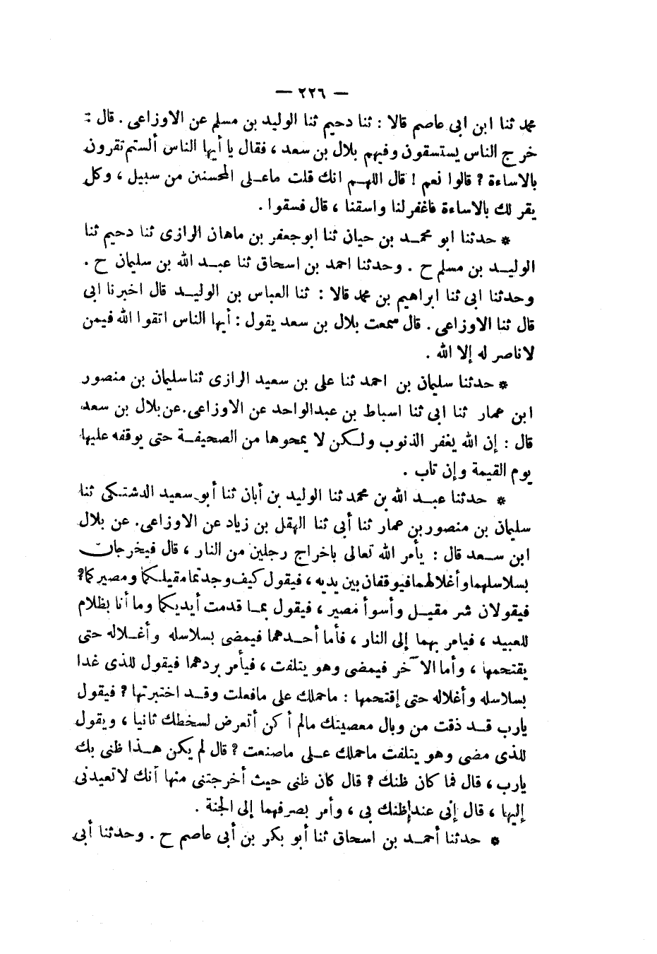 حَدَّثَنَا عَبْدُ اللهِ بْنُ مُحَمَّدٍ، ثنا الْوَلِيدُ بْنُ أَبَانَ، ثنا أَبُو سَعِيدٍ الدَّشْتَكِيُّ، ثنا سُلَيْمَانُ بْنُ مَنْصُورِ بْنِ عَمَّارٍ، ثنا أَبِي، ثنا الْهِقْلُ بْنُ زِيَادٍ، عَنِ الْأَوْزَاعِيِّ، عَنْ بِلَالِ بْنِ سَعْدٍ قَالَ: " §يأْمُرُ اللهُ تَعَالَى بِإِخْرَاجِ رَجُلَيْنِ مِنَ النَّارِ، قَالَ: فَيَخْرُجَانِ بِسَلَاسِلِهِمَا وَأَغْلَالِهِمَا فَيُوقَفَانِ بَيْنَ يَدَيْهِ فَيَقُولُ: كَيْفَ وَجَدْتُمَا مَقِيلَكُمَا وَمَصِيرَكُمَا؟ فَيقُولَانِ: شَرُّ مَقِيلٍ، وَأَسْوَأُ مَصِيرٍ، فَيقُولُ: بِمَا قَدَّمَتْ أَيْدِيكُمَا، وَمَا أَنَا بِظَلَّامٍ لِلْعَبِيدِ، فَيَأْمُرُ بِهِمَا إِلَى النَّارِ، فَأَمَّا أَحَدُهُمَا فَيمْضِي بِسَلَاسِلِهِ وَأَغْلَالِهِ حَتَّى يَقْتَحِمَهَا، وَأَمَّا الْآخَرُ فَيمْضِي وَهُوَ يتَلَفَّتُ فَيَأْمُرُ بِرَدِّهِمَا، فَيقُولُ لِلَّذِي غَدَا بِسَلَاسِلِهِ وَأَغْلَالِهِ حَتَّى اقْتَحَمَهَا: مَا حَمَلَكَ عَلَى مَا فَعَلْتَ وَقَدِ اخْتَرْتَهَا؟ فَيقُولُ: يَا رَبِّ، قَدْ ذُقْتُ مِنْ وَبَالِ مَعْصِيَتِكَ مَا لَمْ أَكُنْ أَتَعَرَّضْ لِسَخَطِكَ ثَانِيًا، وَيَقُولُ لِلَّذِي مَضَى وَهُوَ يتَلَفَّتُ: مَا حَمَلَكَ عَلَى مَا صَنَعْتَ؟ قَالَ: لَمْ يَكُنْ هَذَا ظَنِّي بِكَ يَا رَبِّ، قَالَ: فَمَا كَانَ ظَنُّكَ؟ قَالَ: كَانَ ظَنِّي حَيْثُ أَخْرَجْتَنِي مِنْهَا أَنَّكَ لَا تُعِيدُنِي إِلَيْهَا، قَالَ: إِنِّي عِنْدَ ظَنِّكَ بِي، وَأَمَرَ بِصَرْفِهِمَا إِلَى الْجَنَّةِ "