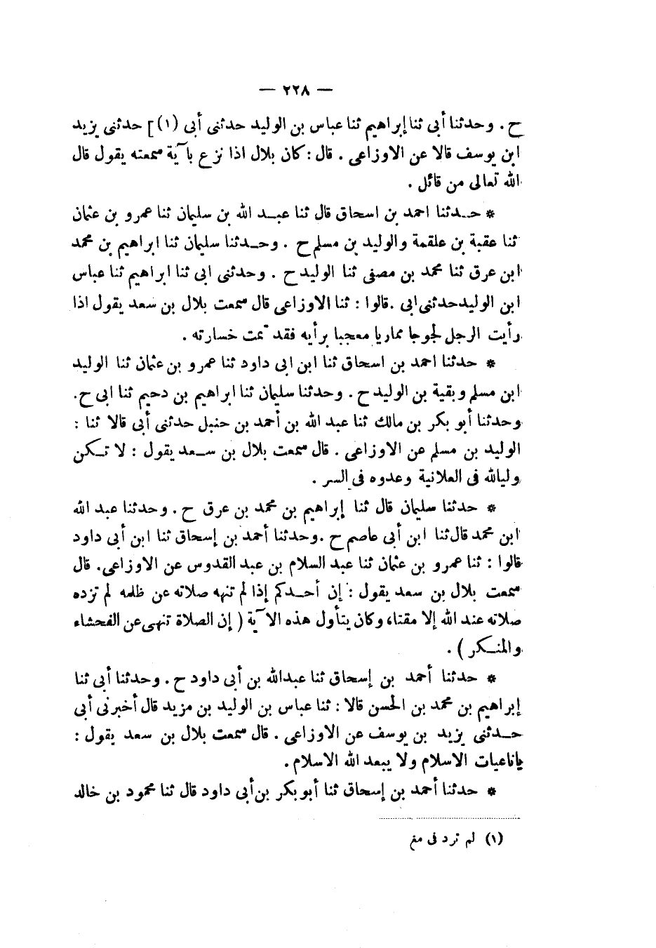 حَدَّثَنَا أَحْمَدُ بْنُ إِسْحَاقَ، ثنا عَبْدُ اللهِ بْنُ أَبِي دَاوُدَ، ح. وَحَدَّثَنَا أَبِي، ثنا إِبْرَاهِيمُ بْنُ مُحَمَّدِ بْنِ الْحَسَنِ قَالَا: ثنا عَبَّاسُ بْنُ الْوَلِيدِ بْنِ مَزْيَدٍ قَالَ: أَخْبَرَنِي أَبِي، حَدَّثَنِي يَزِيدُ بْنُ يُوسُفَ، عَنِ الْأَوْزَاعِيِّ قَالَ: سَمِعْتُ بِلَالَ بْنَ سَعْدٍ يَقُولُ: «§يَا نَاعِيَاتِ الْإِسْلَامِ، وَلَا يُبَعِّدُ اللهُ الْإِسْلَامَ»