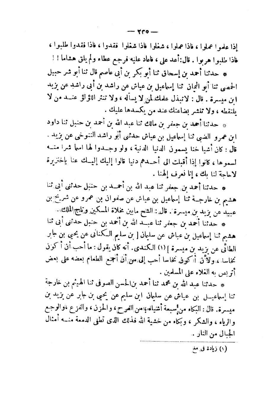 حَدَّثَنَا أَحْمَدُ بْنُ جَعْفَرٍ، ثنا عَبْدُ اللهِ بْنُ أَحْمَدَ بْنِ حَنْبَلٍ، حَدَّثَنِي أَبِي، ثنا هُشَيْمُ بْنُ خَارِجَةَ، ثنا إِسْمَاعِيلُ بْنُ عَيَّاشٍ، عَنْ صَفْوَانَ بْنِ عَمْرٍو، عَنْ شُرَيْحِ بْنِ عُبَيْدٍ، عَنْ يَزِيدَ بْنِ مَيْسَرَةَ قَالَ: «§الشُّحُّ مَا بَيْنَ مِخْلَاةِ الْمِسْكِينِ وَتَاجِ الْمَلِكِ»