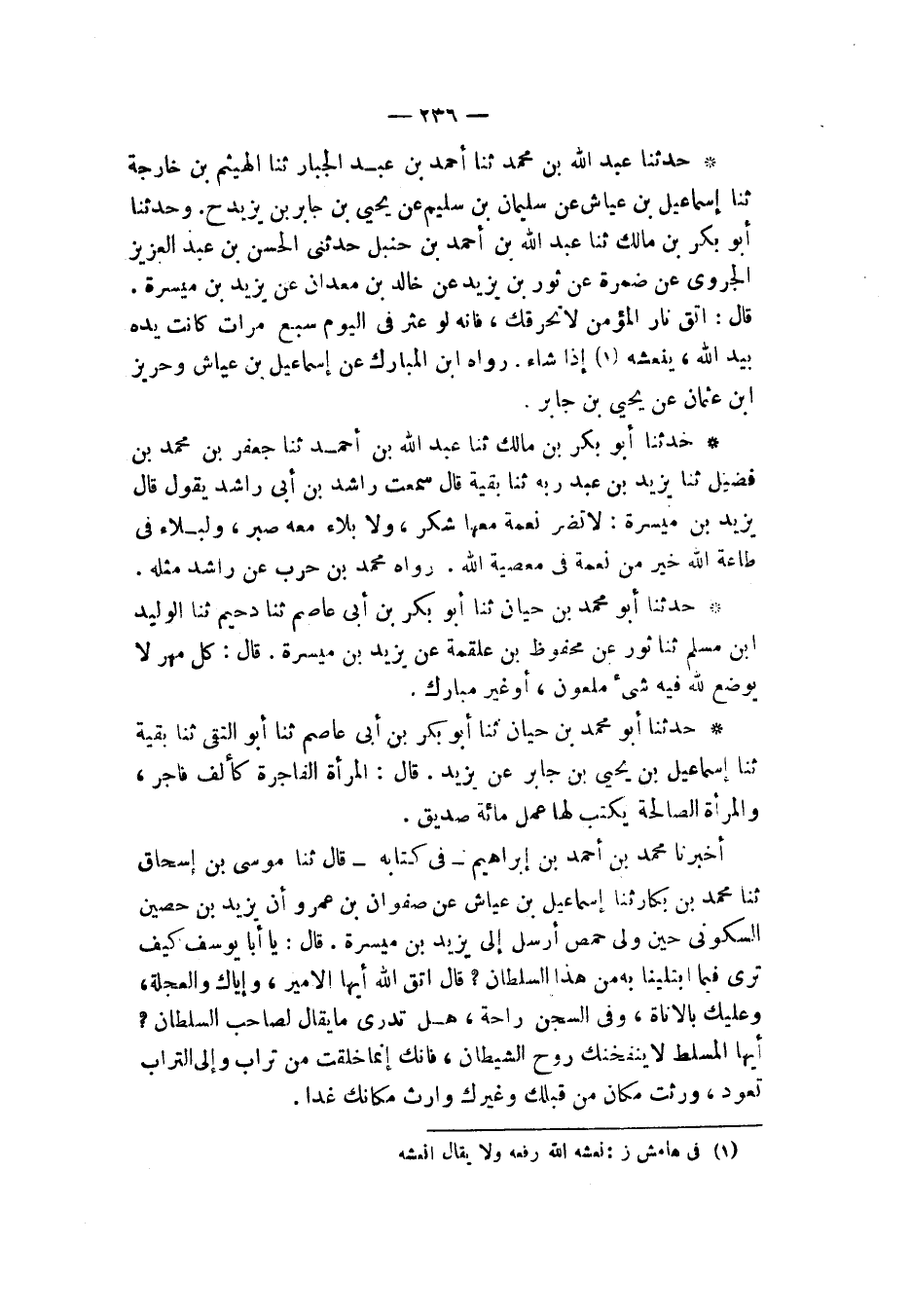 حَدَّثَنَا عَبْدُ اللهِ بْنُ مُحَمَّدٍ، ثنا أَحْمَدُ بْنُ عَبْدِ الْجَبَّارِ، ثنا الْهَيْثَمُ بْنُ خَارِجَةَ، ثنا إِسْمَاعِيلُ بْنُ عَيَّاشٍ، عَنْ سُلَيْمَانَ بْنِ سُلَيْمٍ، عَنْ يَحْيَى بْنِ جَابِرِ بْنِ يَزِيدَ، ح. وَحَدَّثَنَا أَبُو بَكْرِ بْنُ مَالِكٍ، ثنا عَبْدُ اللهِ بْنُ أَحْمَدَ بْنِ حَنْبَلٍ، حَدَّثَنِي الْحَسَنُ بْنُ عَبْدِ الْعَزِيزِ الْجَرَوِيُّ، عَنْ ضَمْرَةَ، عَنْ ثَوْرِ بْنِ يَزِيدَ، عَنْ خَالِدِ بْنِ مَعْدَانَ، عَنْ يَزِيدَ بْنِ مَيْسَرَةَ قَالَ: §اتَّقِ نَارَ الْمُؤْمِنِ لَا تَحْرِقْكَ، فَإِنَّهُ لَوْ عَثَرَ فِي الْيَوْمِ سَبْعَ مَرَّاتٍ كَانَتْ يَدُهُ بِيدِ اللهِ يُنْعِشُهُ إِذَا شَاءَ " رَوَاهُ ابْنُ الْمُبَارَكِ عَنْ إِسْمَاعِيلَ بْنِ عَيَّاشٍ، وَحَرِيزُ بْنُ عُثْمَانَ عَنْ يَحْيَى بْنِ جَابِرٍ