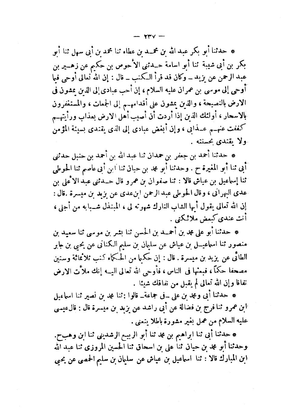 حَدَّثَنَا أَبُو بَكْرٍ عَبْدُ اللهِ بْنُ مُحَمَّدِ بْنِ عَطَاءٍ، ثنا مُحَمَّدُ بْنُ أَبِي سَهْلٍ، ثنا أَبُو بَكْرِ بْنُ أَبِي شَيْبَةَ، ثنا أَبُو أُسَامَةَ، حَدَّثَنِي الْأَحْوَصُ بْنُ حَكِيمٍ، عَنْ زُهَيْرِ بْنِ عَبْدِ الرَّحْمَنِ، عَنْ يَزِيدَ - وَكَانَ قَدْ قَرَأَ الْكِتَابَ - قَالَ: إِنَّ اللهَ تَعَالَى أَوْحَى فِيمَا أَوْحَى إِلَى مُوسَى بْنِ عِمْرَانَ عَلَيْهِ السَّلَامُ: «§إِنَّ أَحَبَّ عِبَادِي إِلَيَّ الَّذِينَ يَمْشُونَ فِي الْأَرْضِ بِالنَّصِيحَةِ، وَالَّذِينَ يَمْشُونَ عَلَى أَقْدَامِهِمْ إِلَى الْجُمُعَاتِ، وَالْمُسْتَغْفِرُونَ بِالْأَسْحَارِ، أُولَئِكَ الَّذِينَ إِذَا أَرَدْتُ أَنَّ أُصِيبَ أَهْلَ الْأَرْضِ بِعَذَابٍ وَرَأَيْتُهُمْ كَفَفْتُ عَنْهُمْ عَذَابِي، وَإِنَّ أَبْغَضَ عِبَادِي إِلَيَّ الَّذِي يَقْتَدِي بِسَيِّئَةِ الْمُؤْمِنِ وَلَا يَقْتَدِي بِحَسَنَتِهِ»