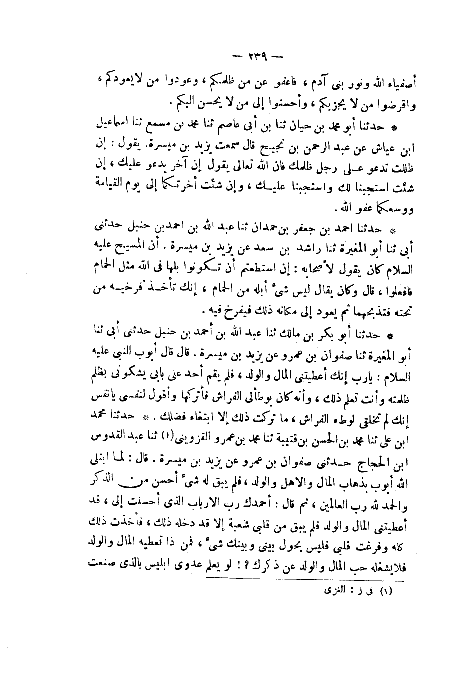 حَدَّثَنَا مُحَمَّدُ بْنُ عَلِيٍّ، ثنا مُحَمَّدُ بْنُ الْحَسَنِ بْنِ قُتَيْبَةَ، ثنا مُحَمَّدُ بْنُ عَمْرٍو الْقَزْوِينِيُّ، ثنا عَبْدُ الْقُدُّوسِ بْنُ الْحَجَّاجِ، حَدَّثَنِي صَفْوَانُ بْنُ عَمْرٍو، عَنْ يَزِيدَ بْنِ مَيْسَرَةَ قَالَ: §لَمَّا ابْتَلَى اللهُ أَيُّوبَ بِذَهَابِ الْمَالِ وَالْأَهْلِ وَالْوَلَدِ، فَلَمْ يَبْقَ لَهُ شَيْءٌ أَحْسَنُ مِنَ الذِّكْرِ، وَالْحَمْدُ لِلَّهِ رَبِّ الْعَالَمِينَ، ثُمَّ قَالَ: أَحْمَدُكَ رَبَّ الْأَرْبَابِ الَّذِي أَحْسَنْتَ إِلَيَّ، قَدْ أَعْطَيْتَنِي الْمَالَ وَالْوَلَدَ، فَلَمْ يَبْقَ مِنْ قَلْبِي شُعْبَةٌ إِلَّا قَدْ دَخَلَهُ ذَلِكَ، فَأَخَذْتُ ذَلِكَ كُلَّهُ وَفَرَّغْتُ قَلْبِي فَلَيْسَ يَحُولُ بَيْنِي وَبَيْنَكَ شَيْءٌ، فَمَنْ ذَا تُعْطِيهِ الْمَالَ وَالْوَلَدَ، فَلَا يَشْغَلْهُ حُبُّ الْمَالِ وَالْوَلَدِ عَنْ ذِكْرِكَ، لَوْ يَعْلَمْ عَدُوِّي إِبْلِيسُ بِالَّذِي صَنَعْتَ -[240]- إِلَيَّ حَسَدَنِي، قَالَ: فَلَقِيَ إِبْلِيسُ مِنْ هَذَا شَيْئًا مُنْكَرًا "