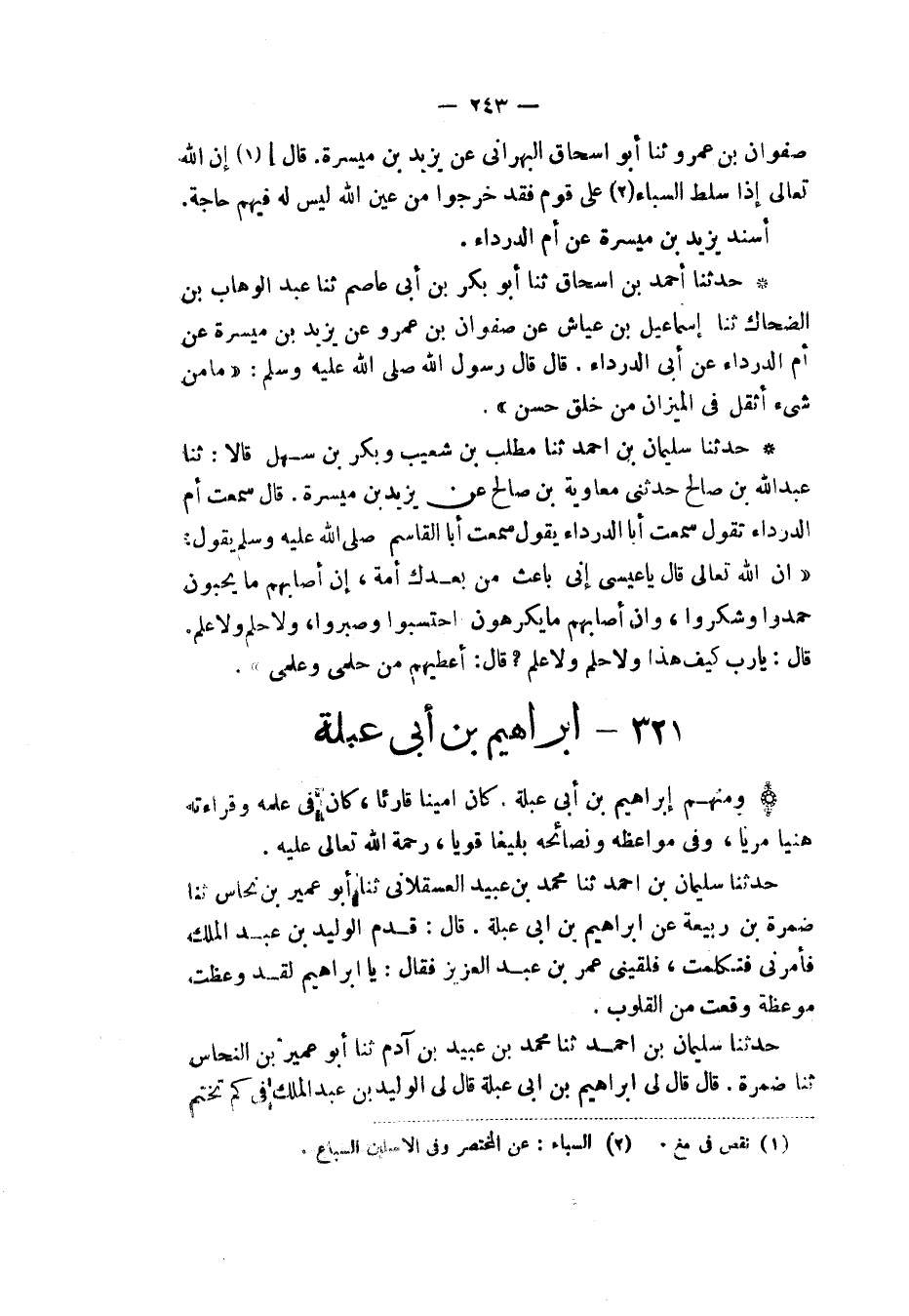 حَدَّثَنَا أَحْمَدُ بْنُ إِسْحَاقَ، ثنا أَبُو بَكْرِ بْنُ أَبِي عَاصِمٍ، ثنا عَبْدُ الْوَهَّابِ بْنُ الضَّحَّاكِ، ثنا إِسْمَاعِيلُ بْنُ عَيَّاشٍ، عَنْ صَفْوَانَ بْنِ عَمْرٍو، عَنْ يَزِيدَ بْنِ مَيْسَرَةَ، عَنْ أُمِّ الدَّرْدَاءِ، عَنْ أَبِي الدَّرْدَاءِ قَالَ: قَالَ رَسُولُ اللهِ صَلَّى اللهُ عَلَيْهِ وَسَلَّمَ: «§مَا مِنْ شَيْءٍ أَثْقَلَ فِي الْمِيزَانِ مِنْ خُلُقٍ حَسَنٍ»