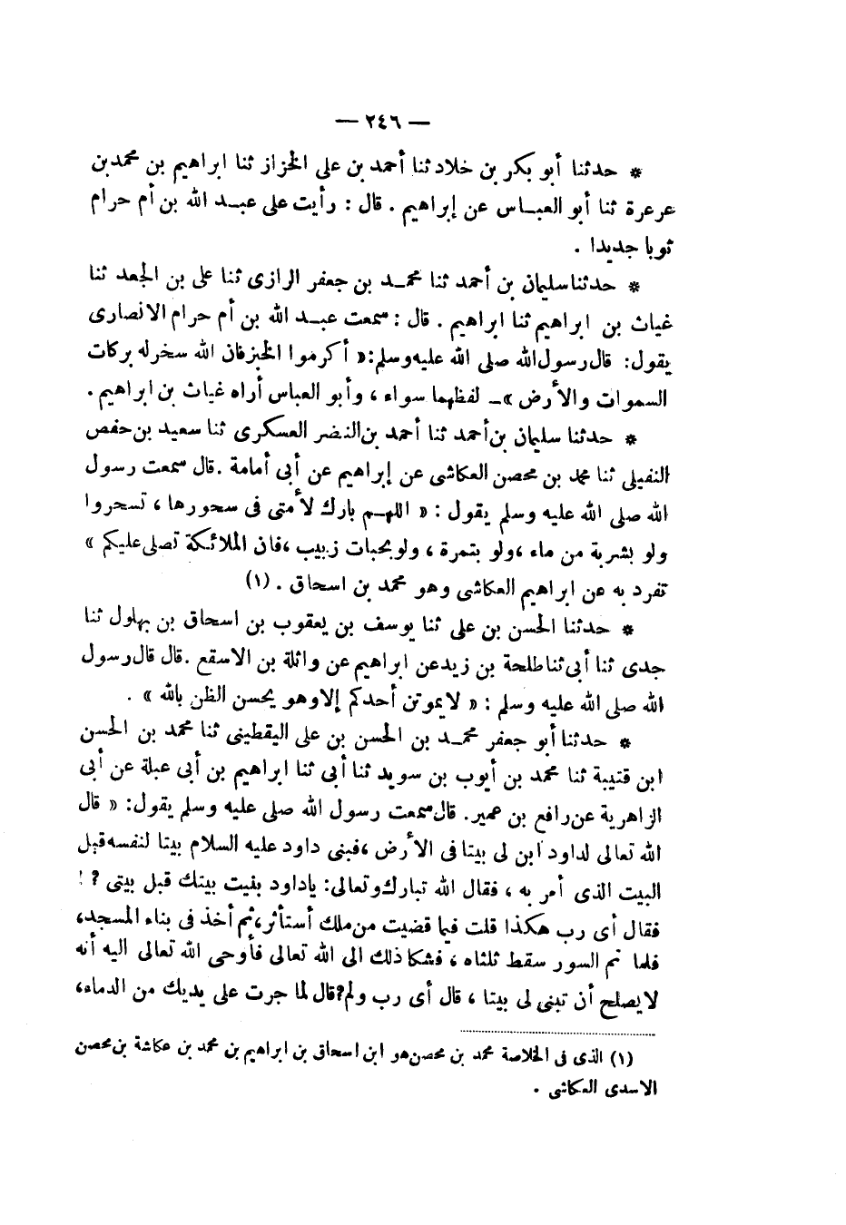 حَدَّثَنَا أَبُو بَكْرِ بْنُ خَلَّادٍ، ثنا أَحْمَدُ بْنُ عَلِيٍّ الْخَزَّازُ، ثنا إِبْرَاهِيمُ بْنُ مُحَمَّدِ بْنِ عَرْعَرَةَ، ثنا أَبُو الْعَبَّاسِ، عَنْ إِبْرَاهِيمَ قَالَ: «§رَأَيْتُ عَلَى عَبْدِ اللهِ بْنِ أُمِّ حَرَامٍ ثَوْبًا جَدِيدًا»